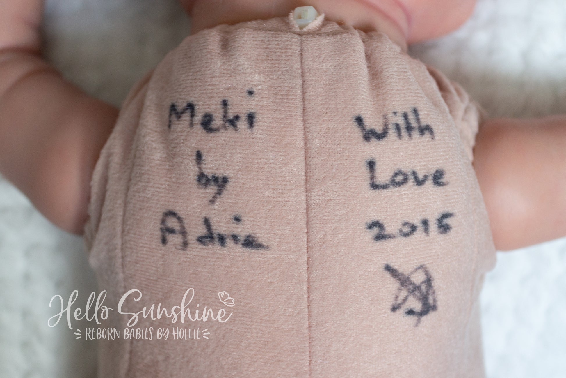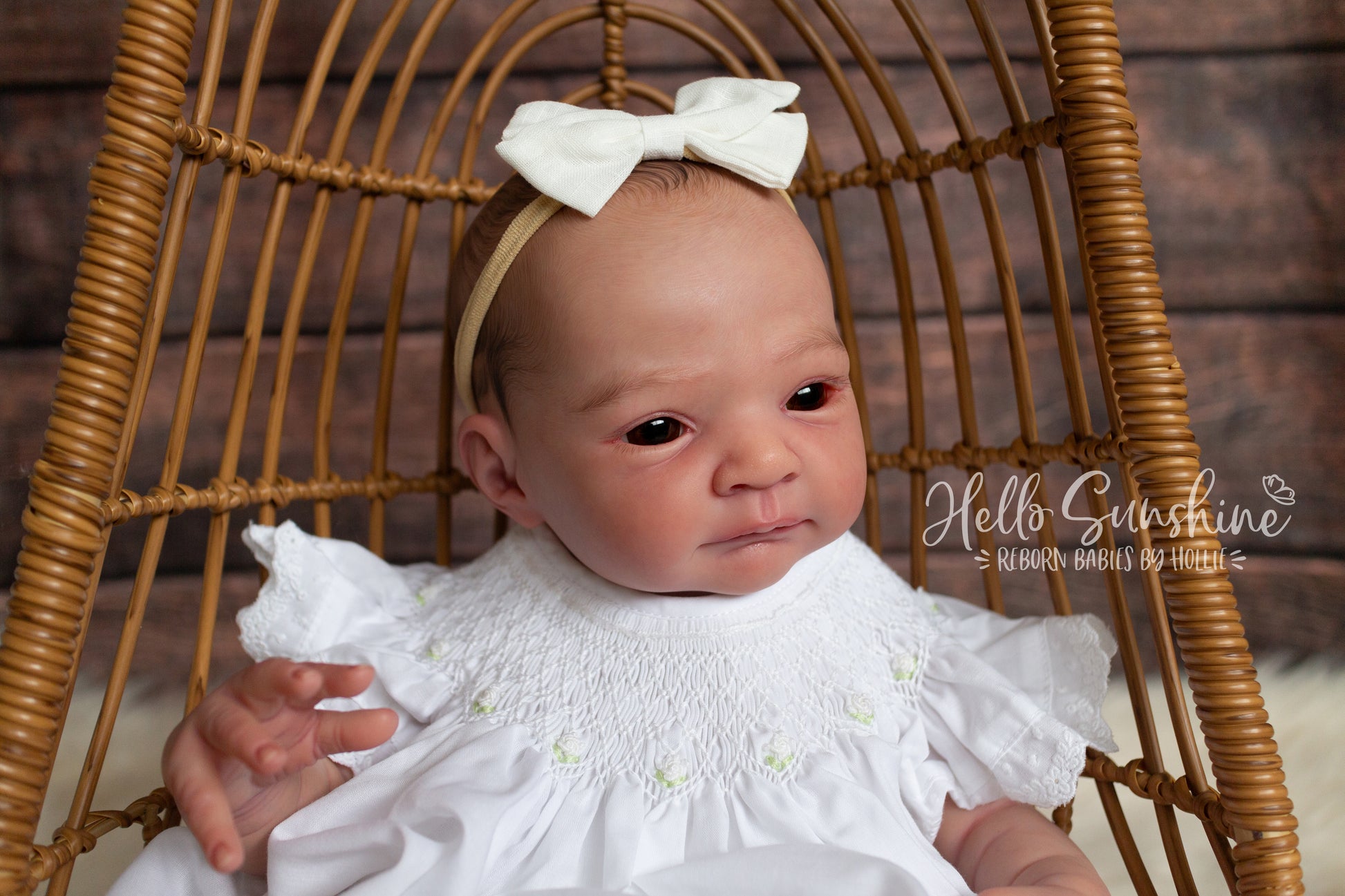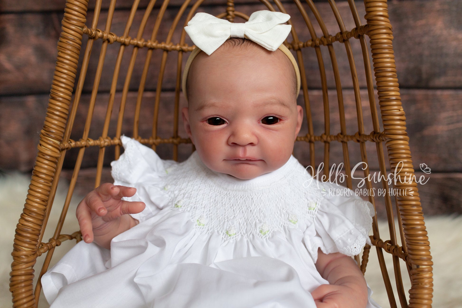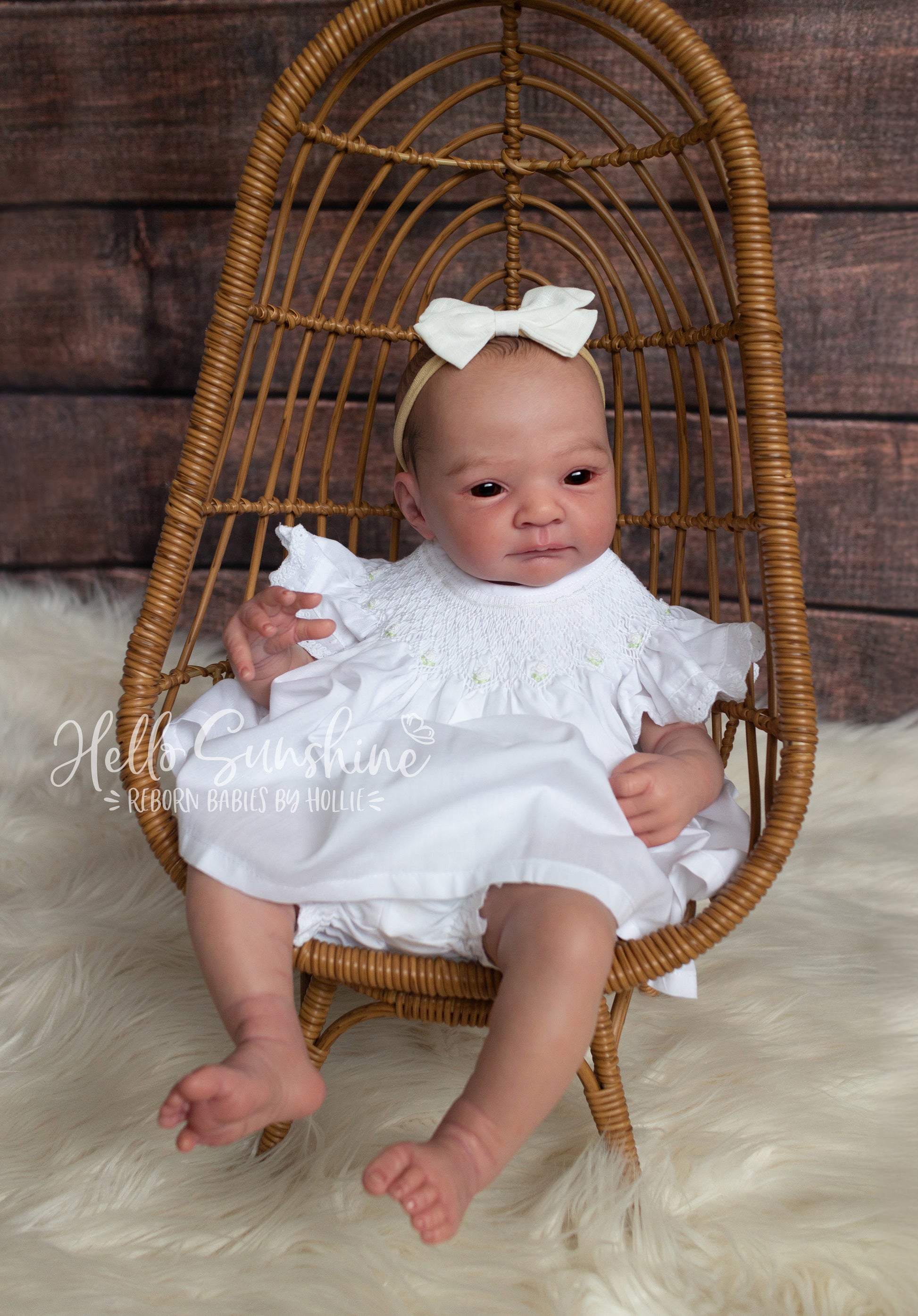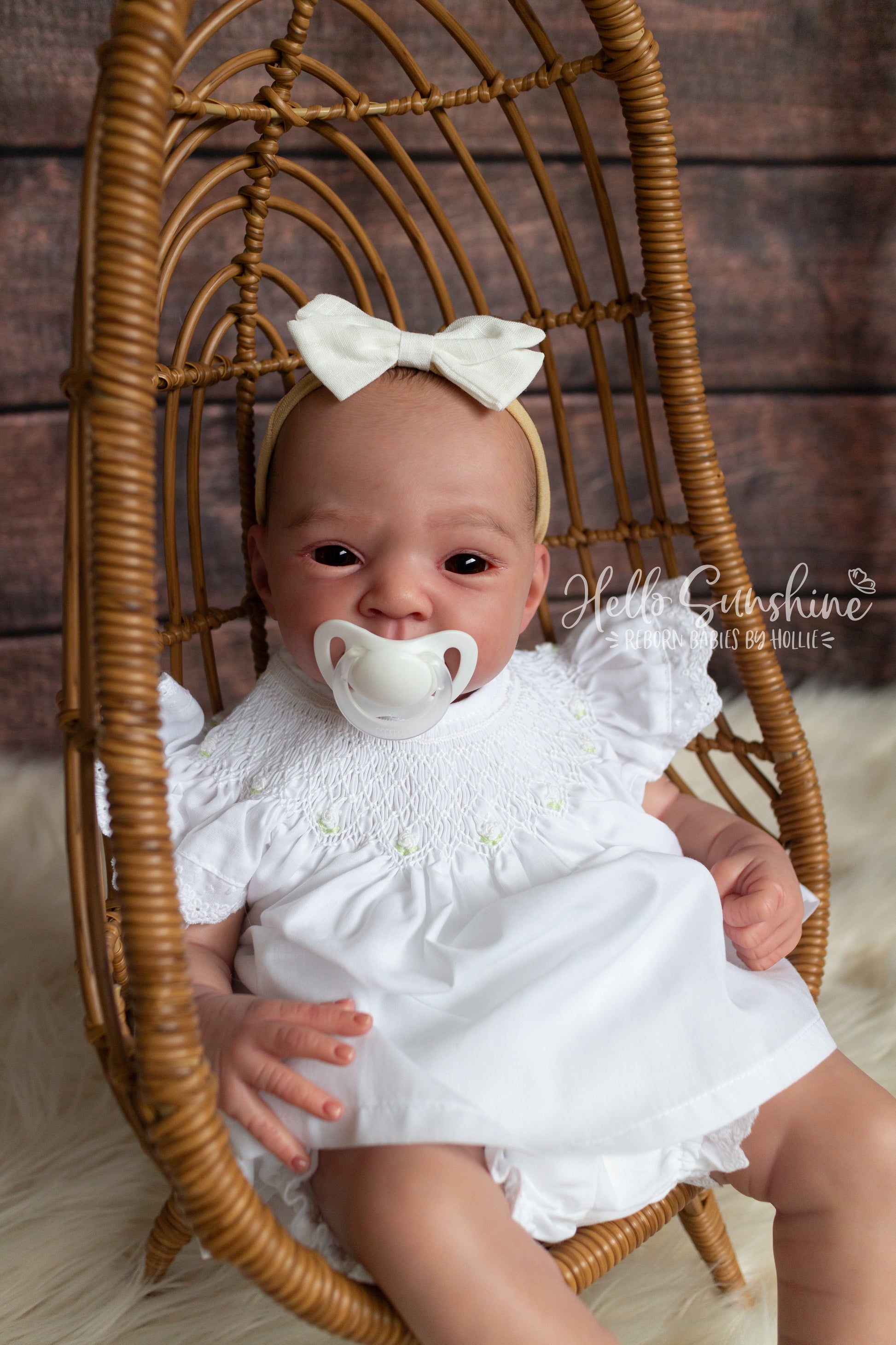 This sweet portrait reborn of the real-life Meki, went home with weighted swivel vinyl limbs, faux suede weighted body, magnet dummy, onesies, bloomers, two-piece romper set, smocked dress with bloomers and knitted wrap.