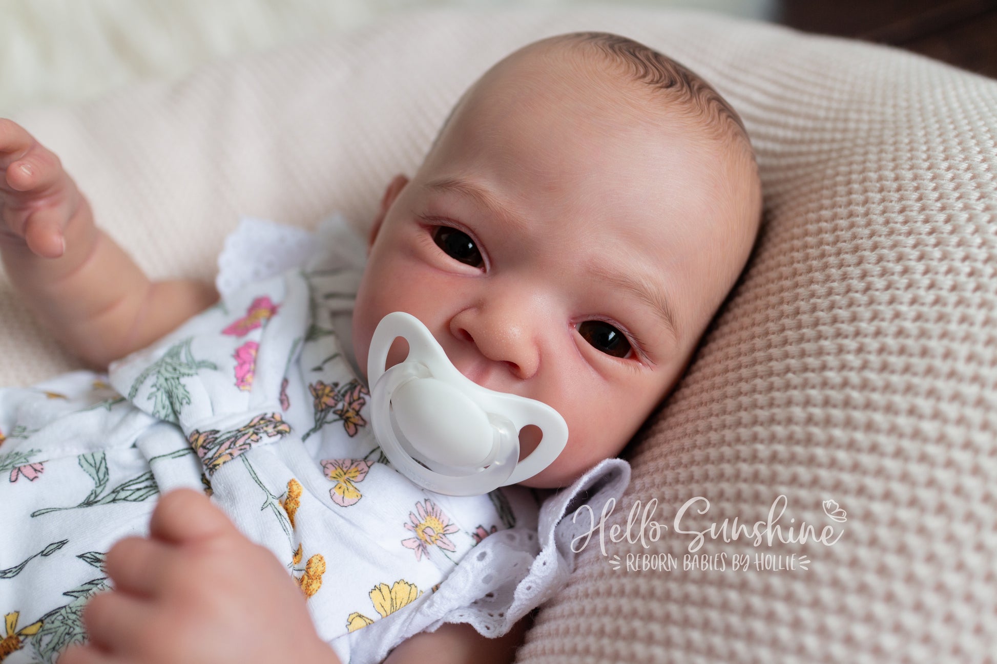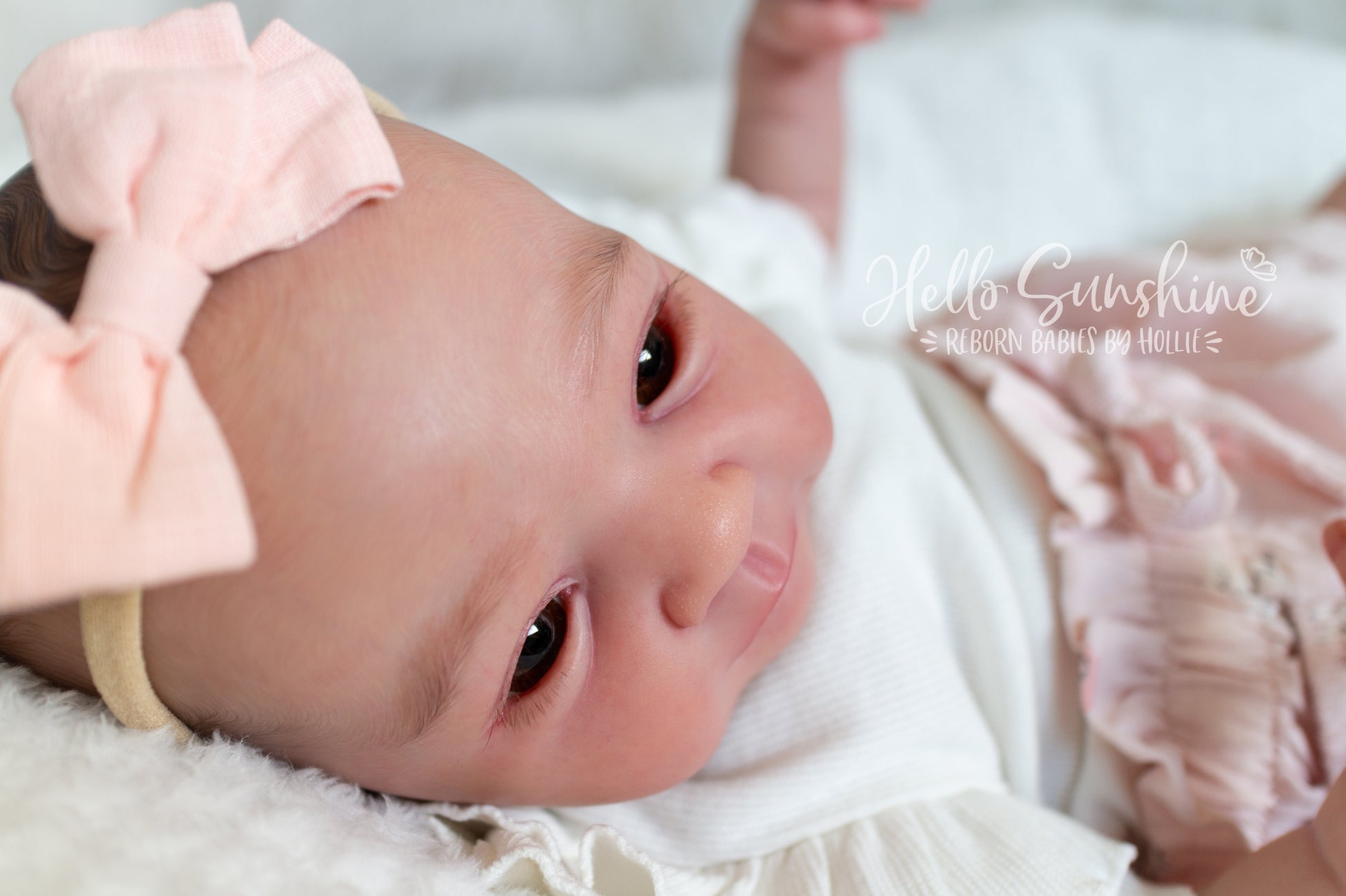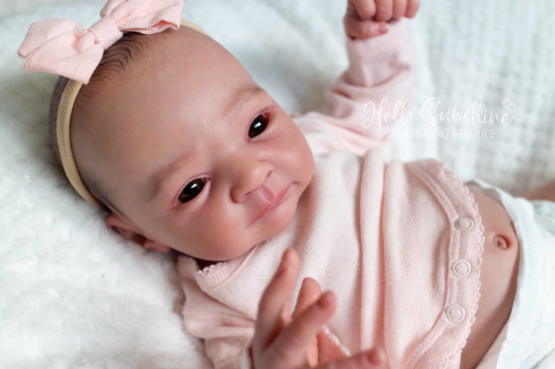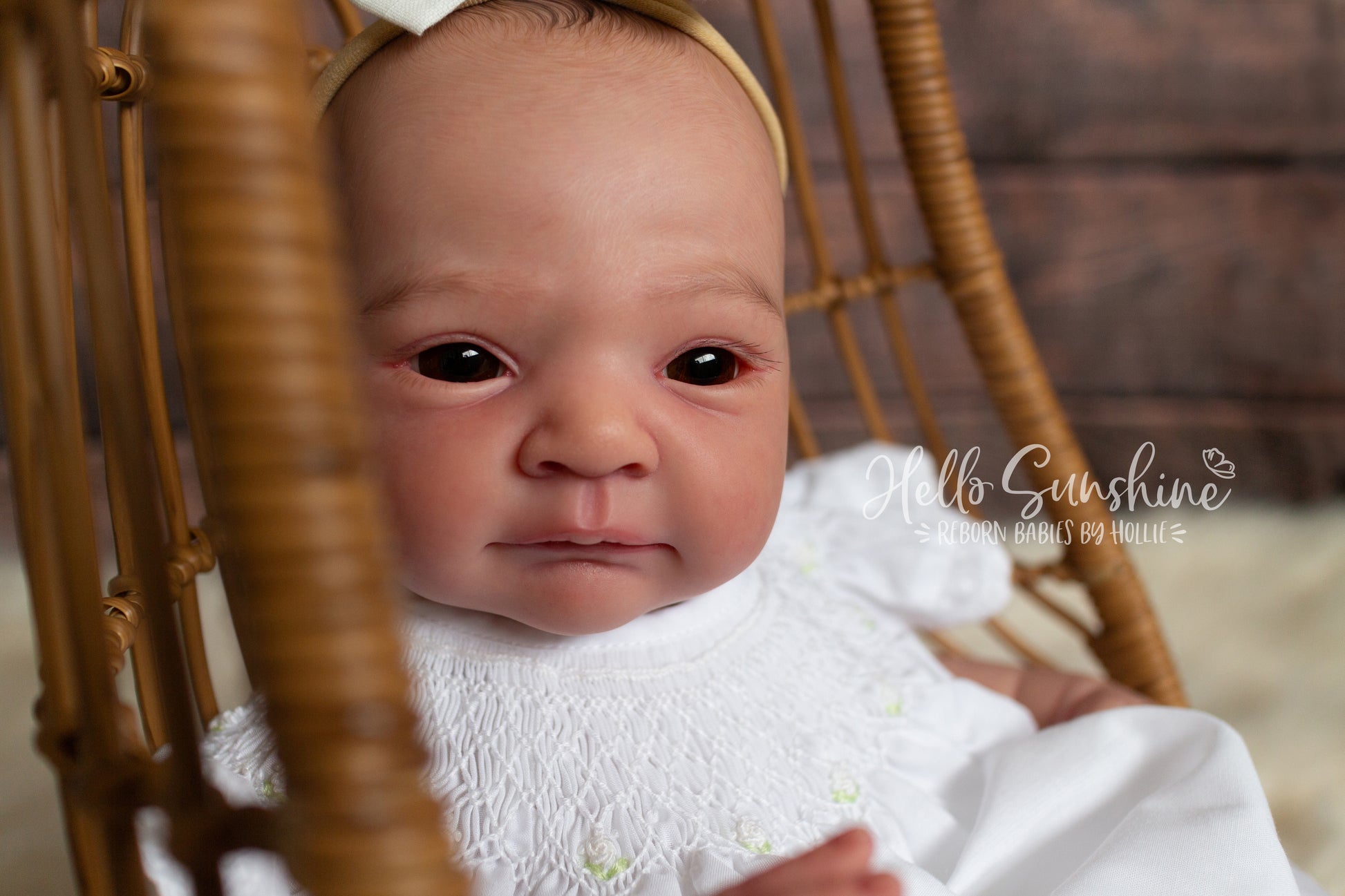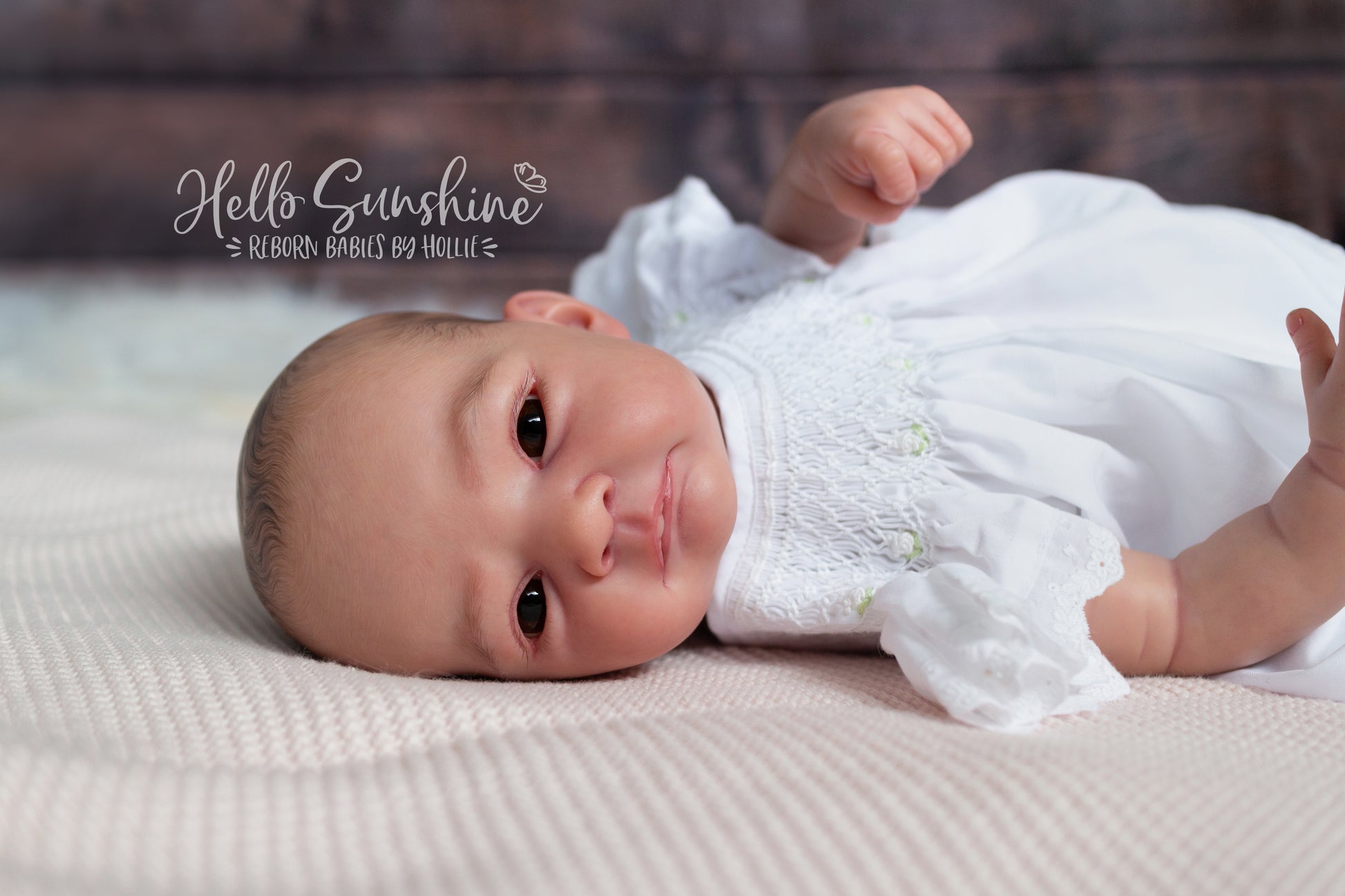 This sweet portrait reborn of the real-life Meki, went home with weighted swivel vinyl limbs, faux suede weighted body, magnet dummy, onesies, bloomers, two-piece romper set, smocked dress with bloomers and knitted wrap.