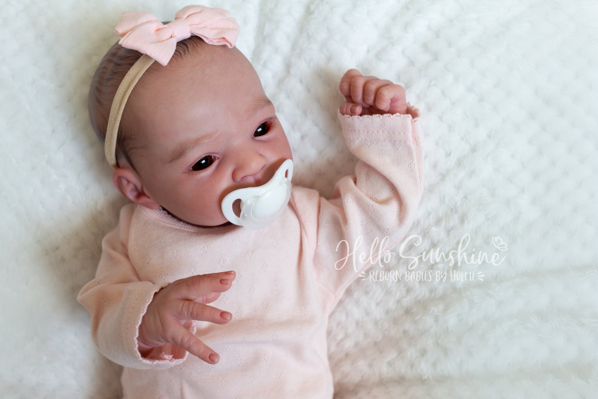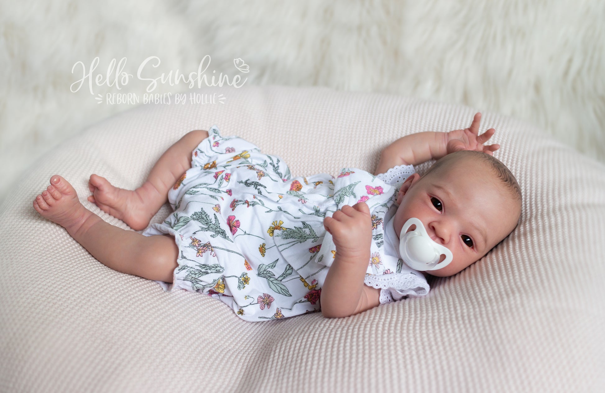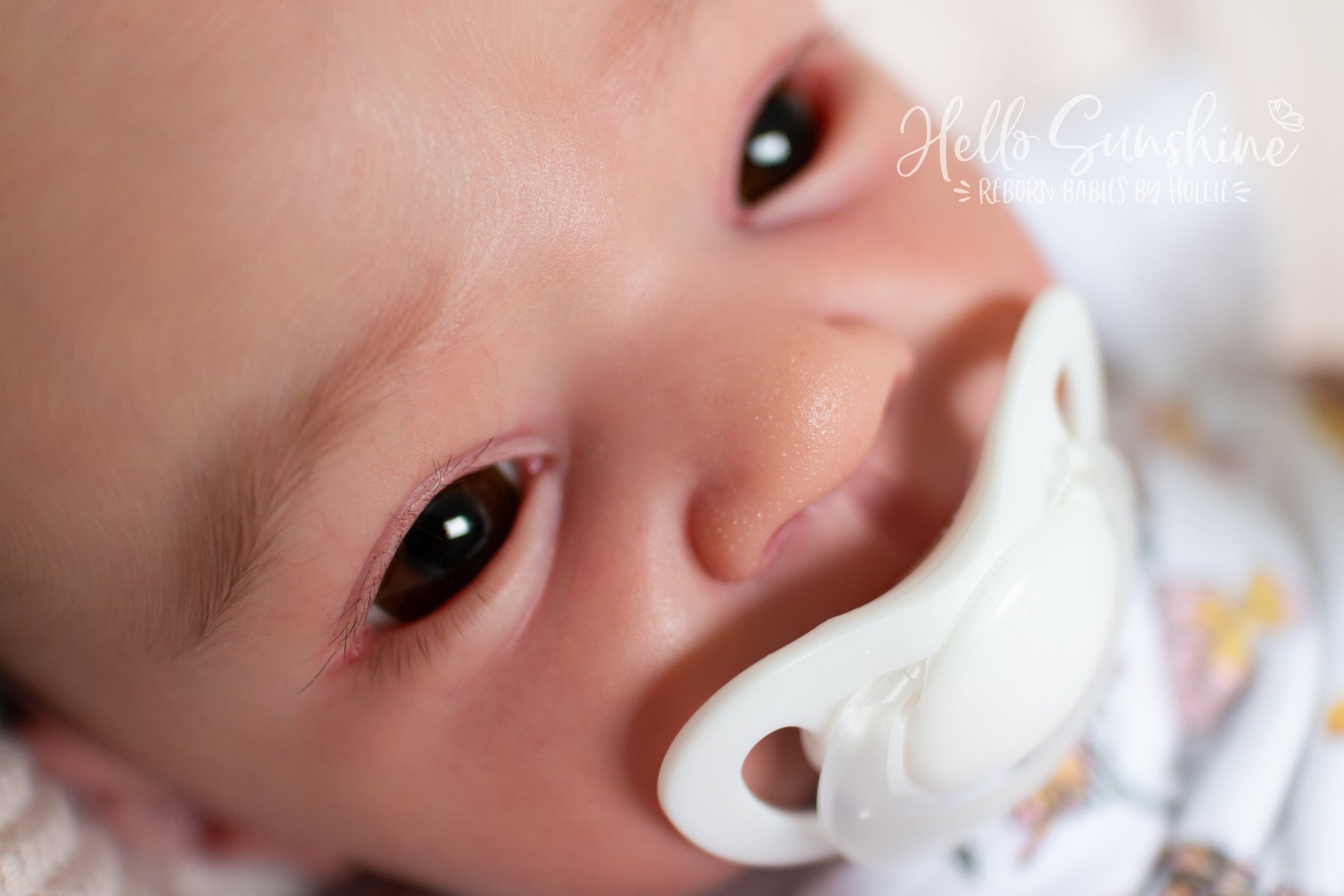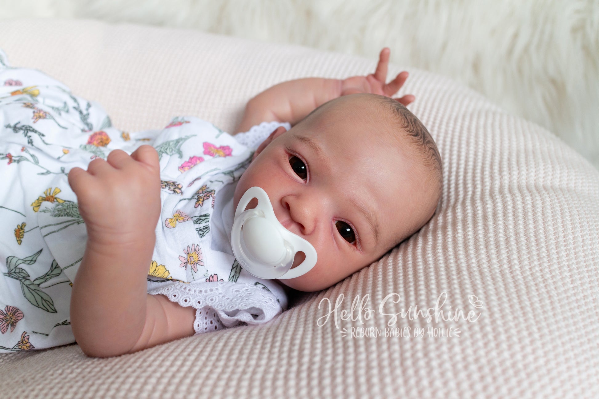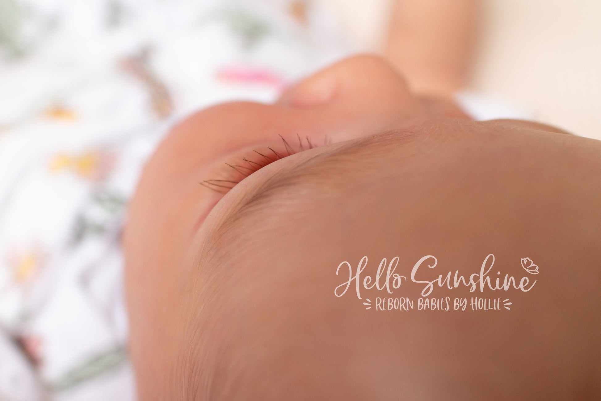 This sweet portrait reborn of the real-life Meki, went home with weighted swivel vinyl limbs, faux suede weighted body, magnet dummy, onesies, bloomers, two-piece romper set, smocked dress with bloomers and knitted wrap.