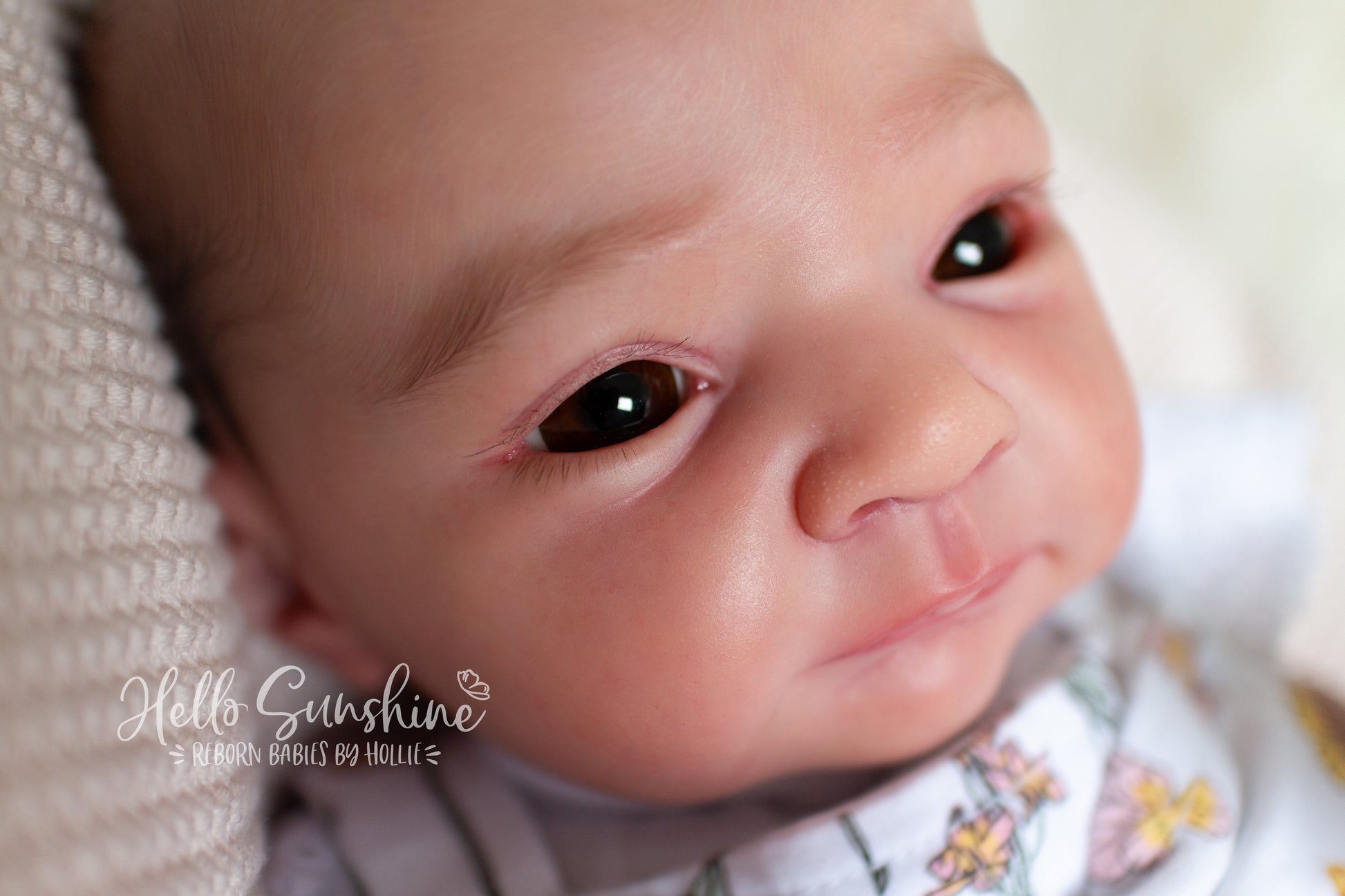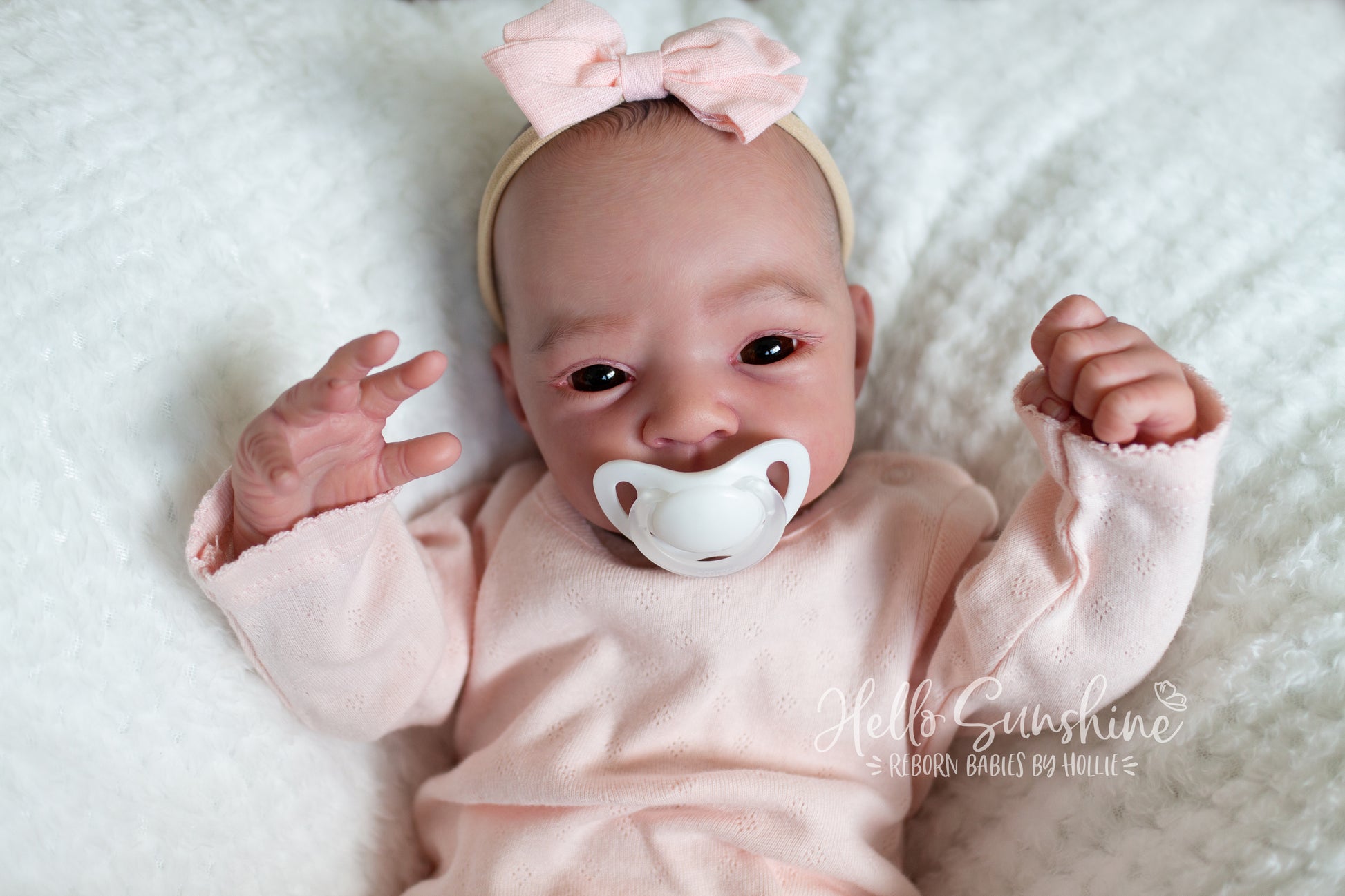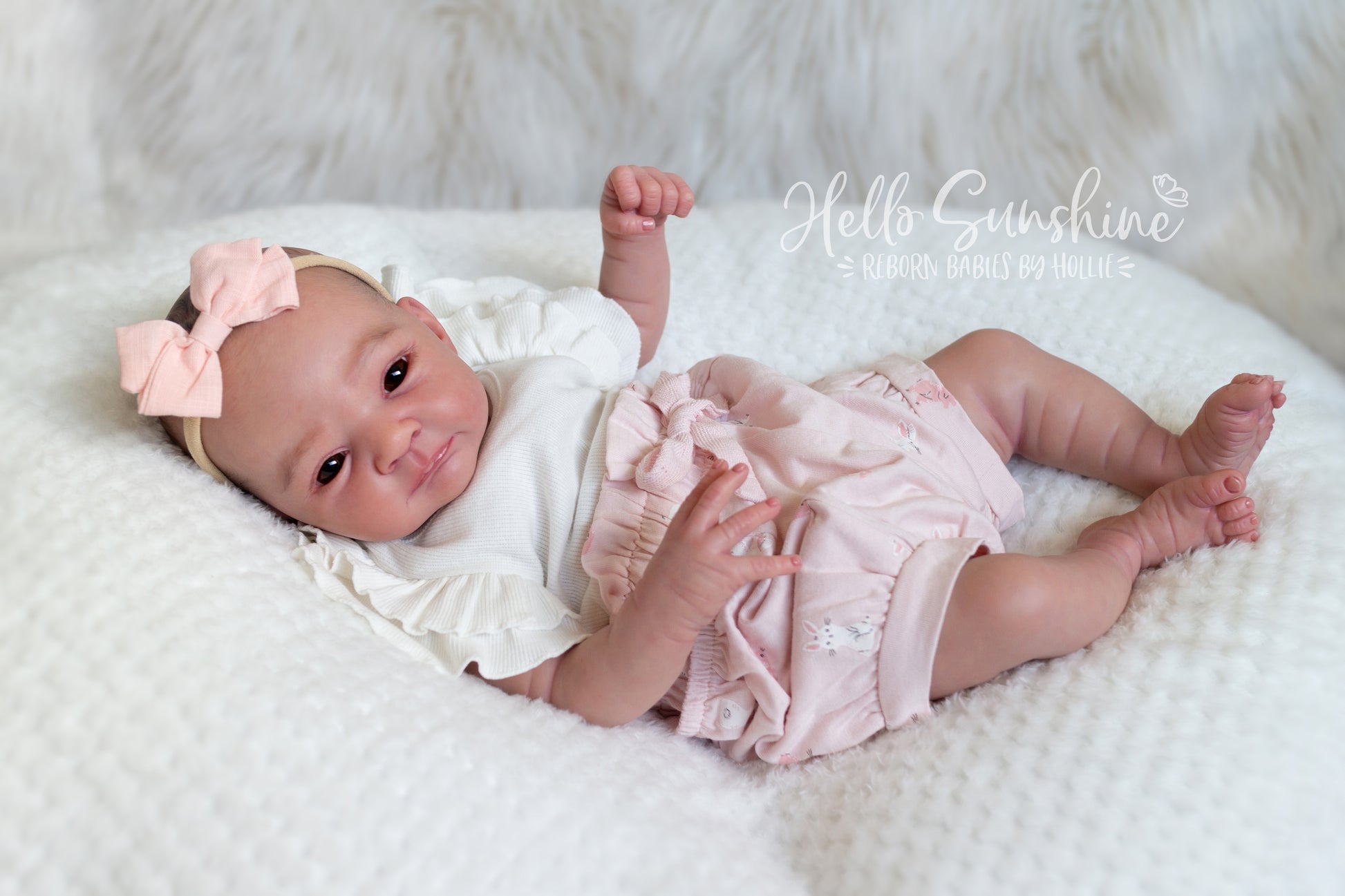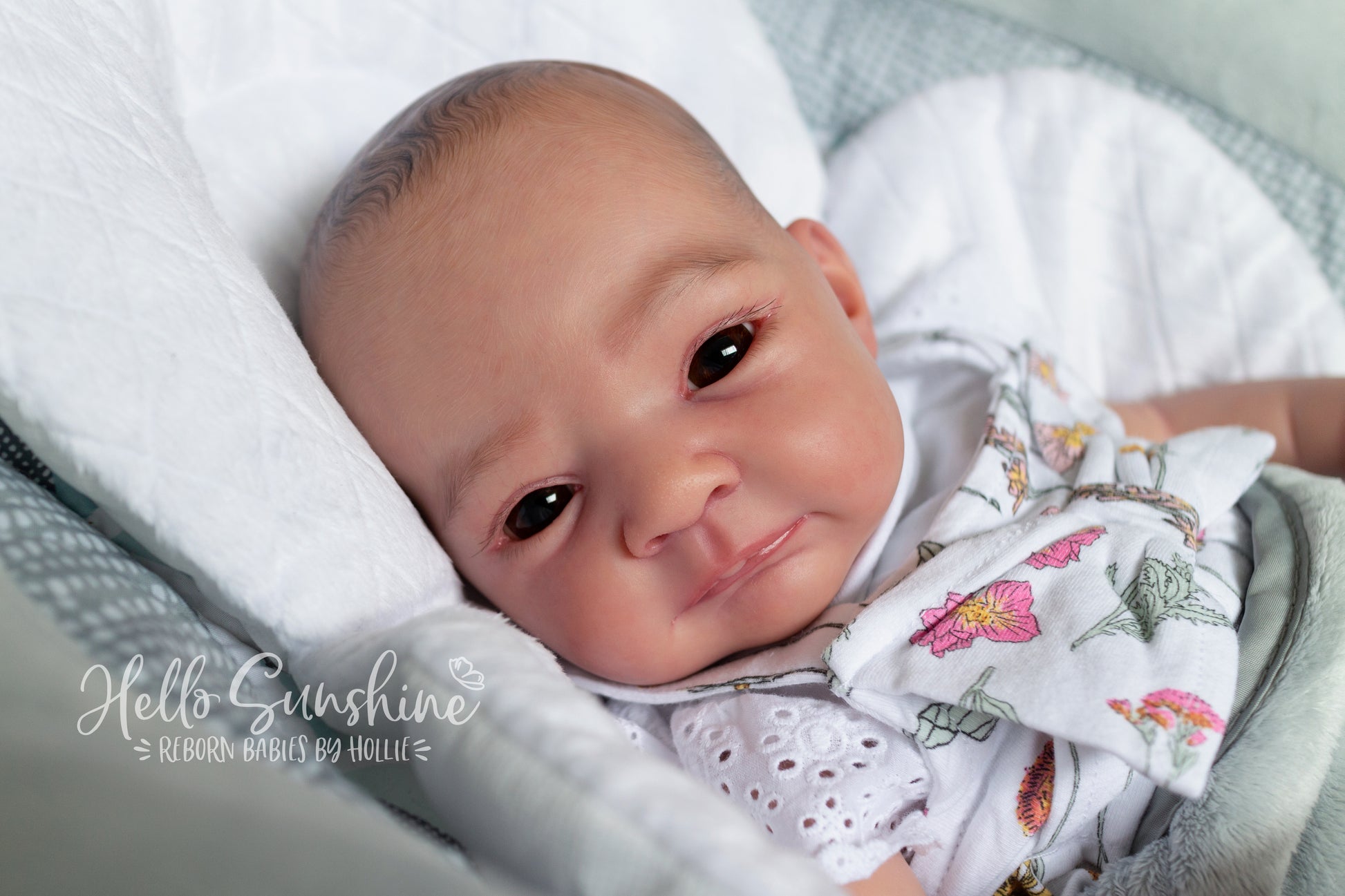 This sweet portrait reborn of the real-life Meki, went home with weighted swivel vinyl limbs, faux suede weighted body, magnet dummy, onesies, bloomers, two-piece romper set, smocked dress with bloomers and knitted wrap.