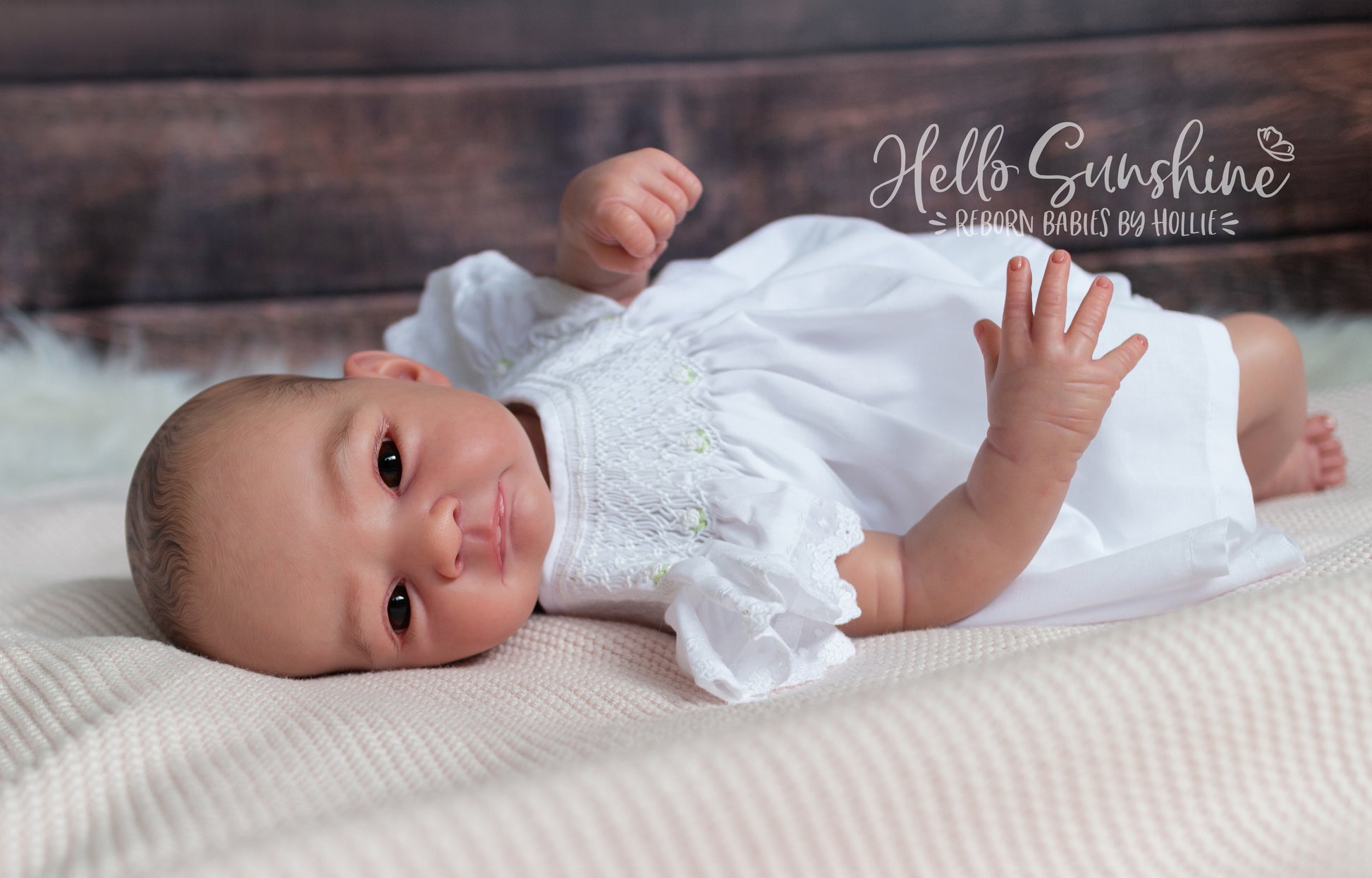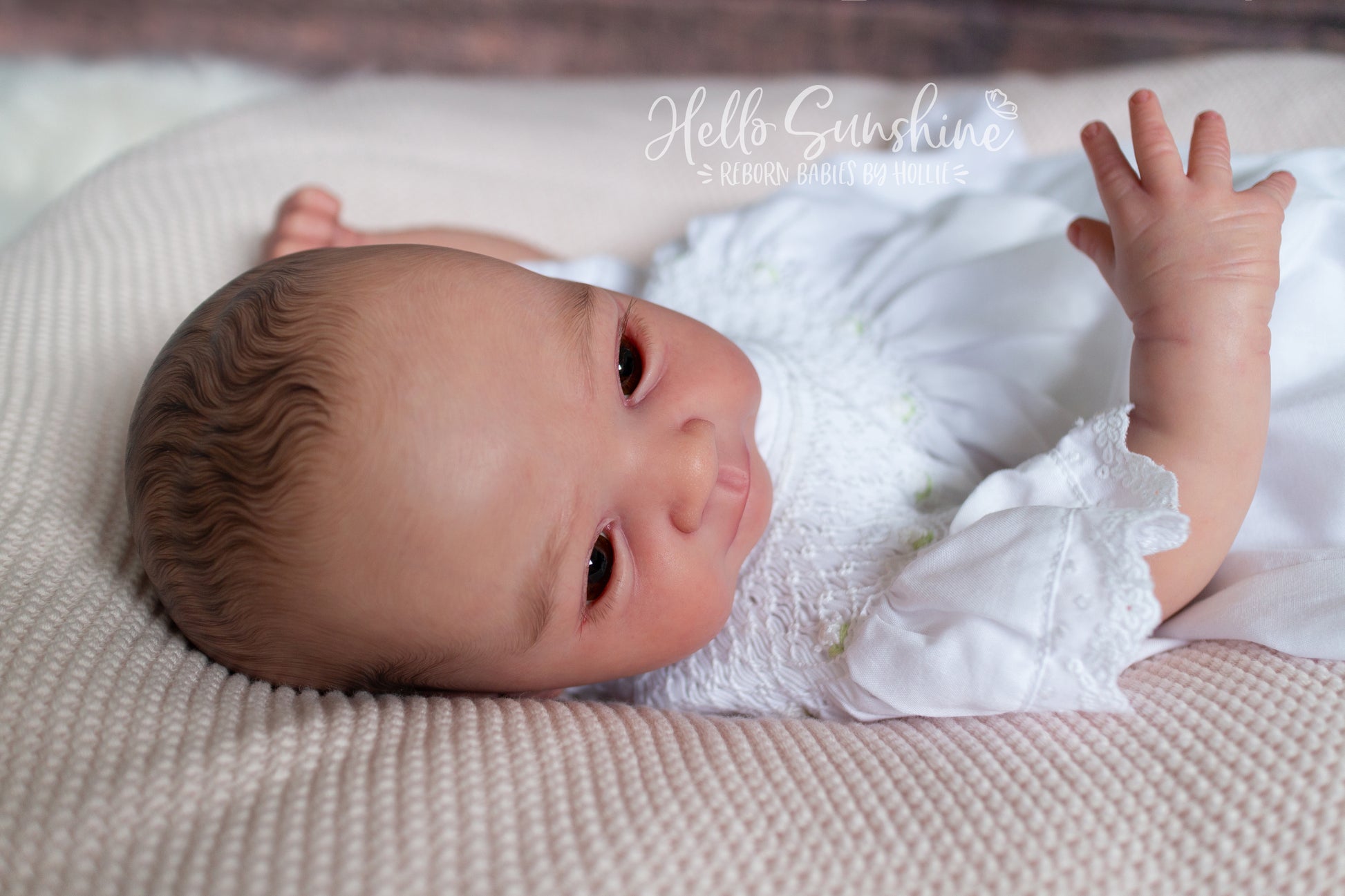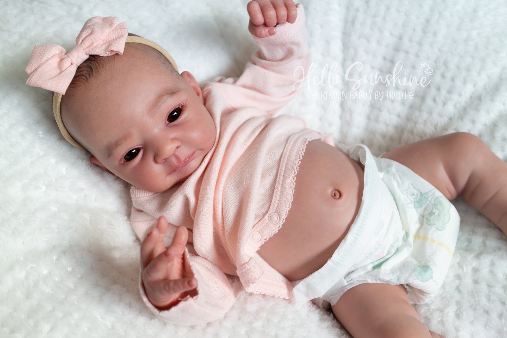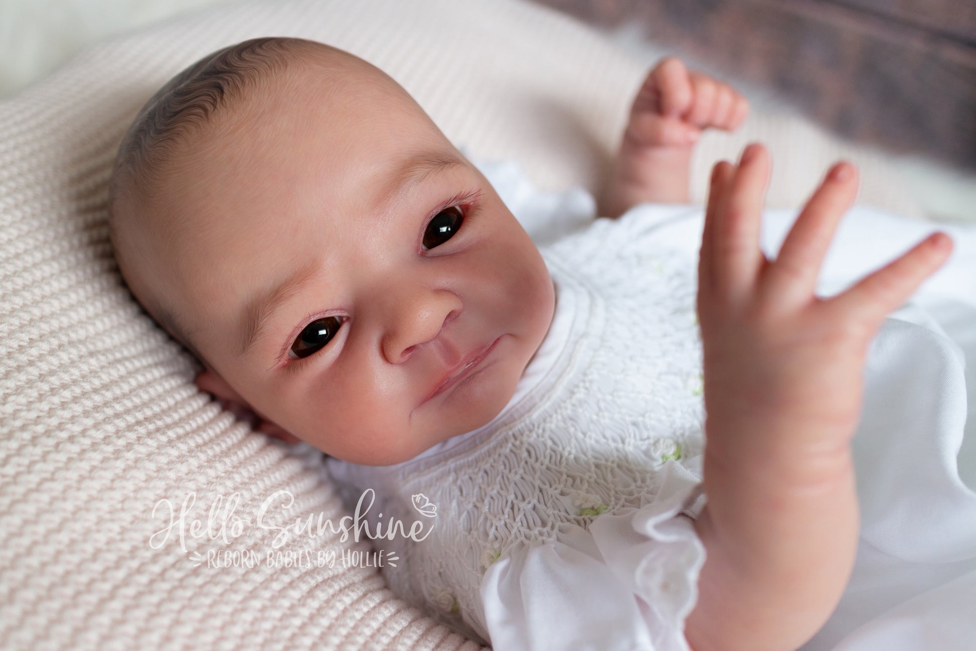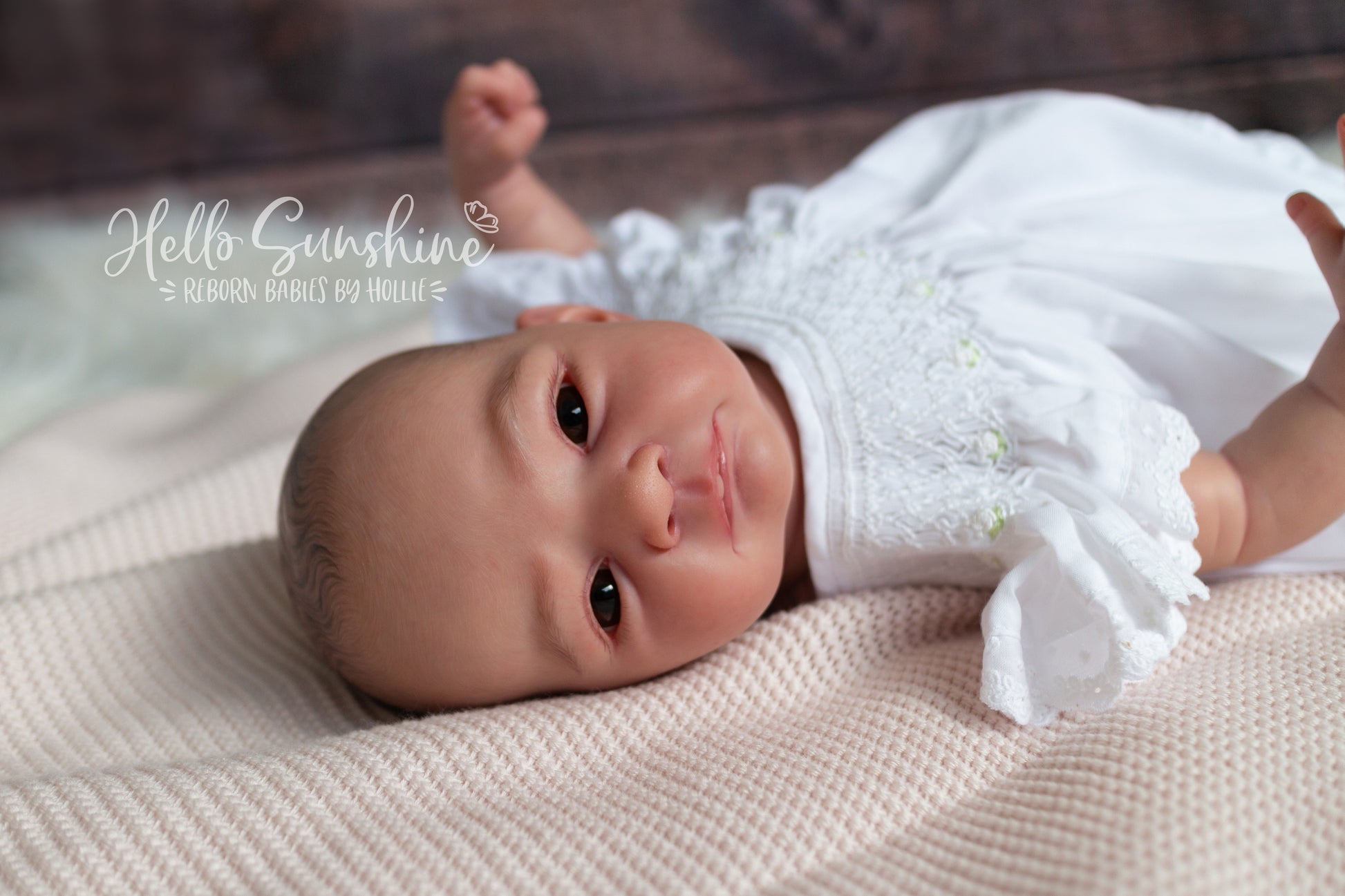 This sweet portrait reborn of the real-life Meki, went home with weighted swivel vinyl limbs, faux suede weighted body, magnet dummy, onesies, bloomers, two-piece romper set, smocked dress with bloomers and knitted wrap.