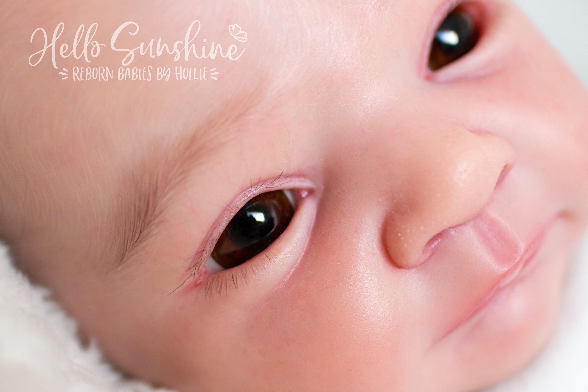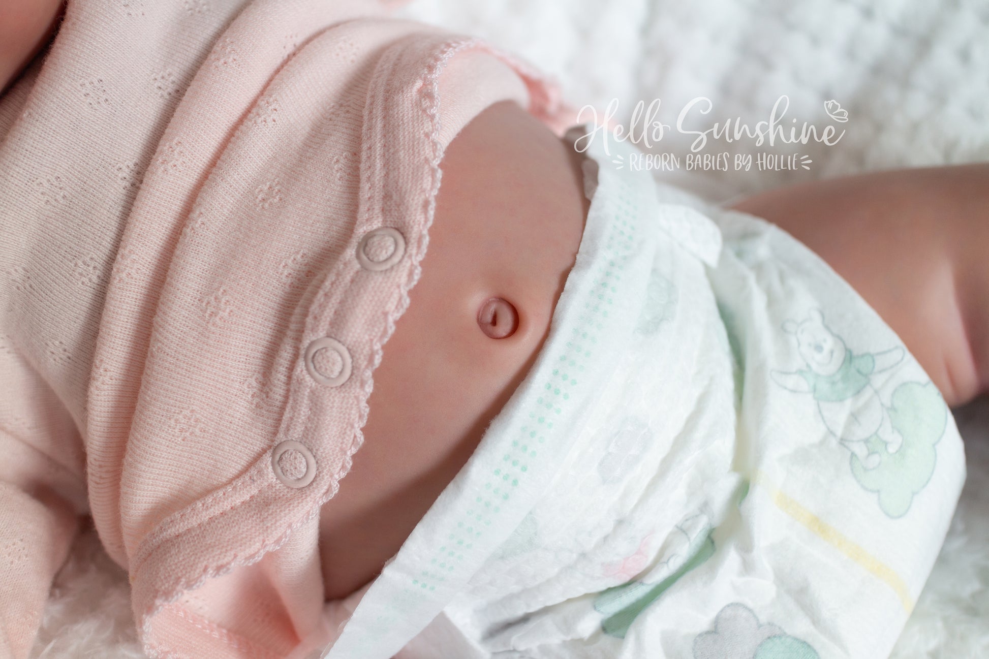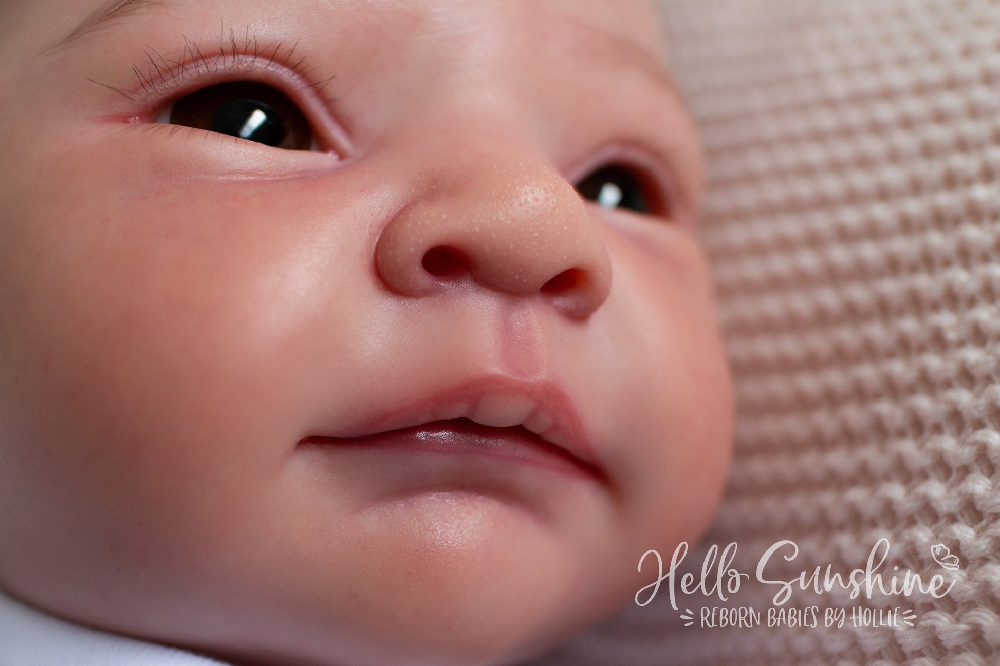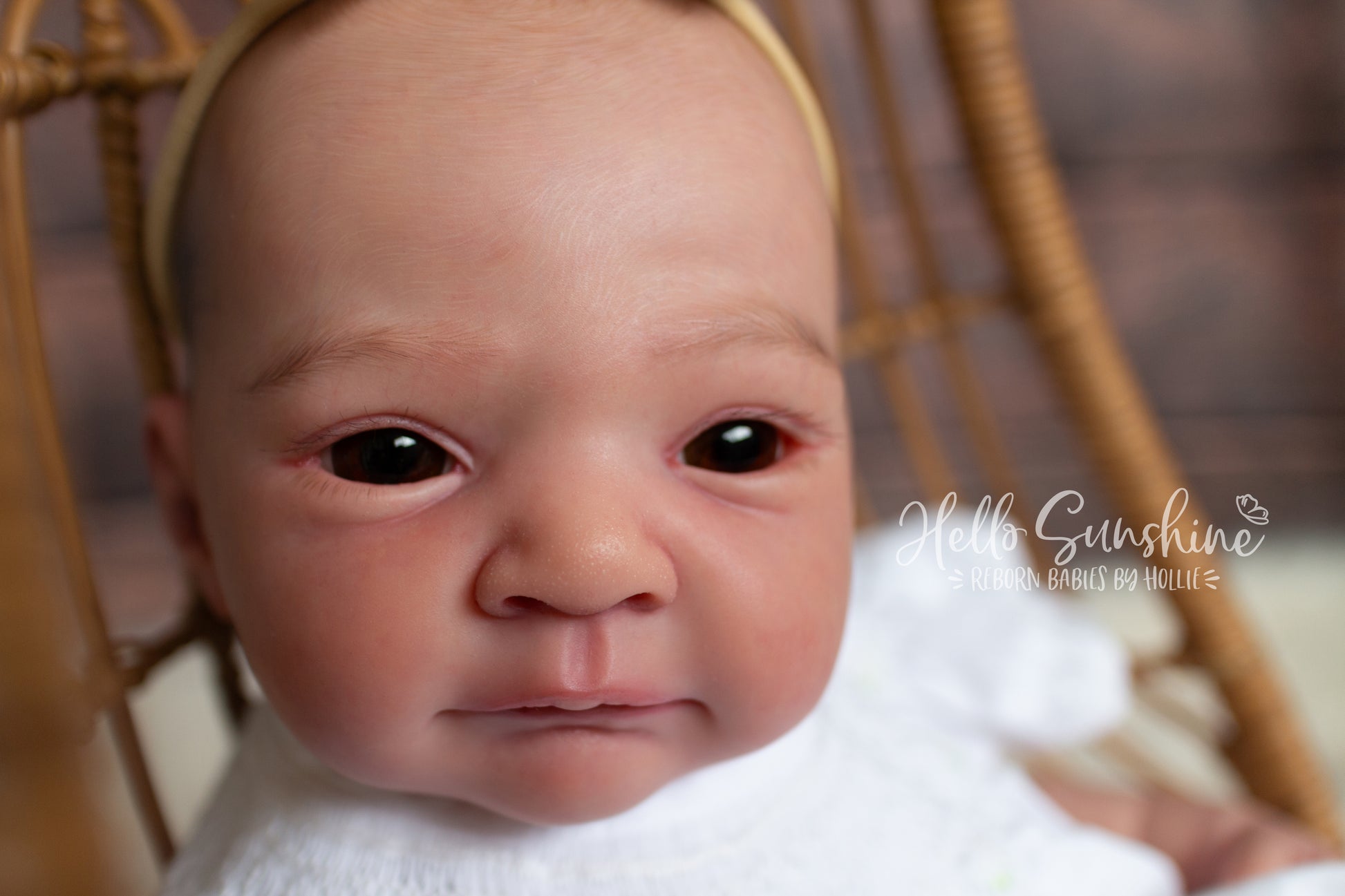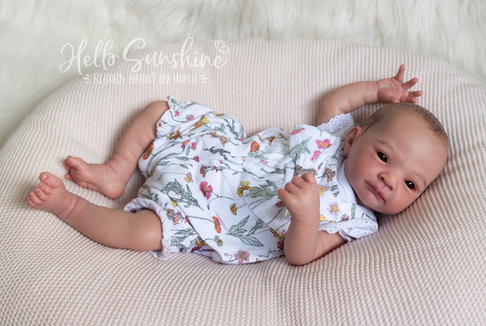 This sweet portrait reborn of the real-life Meki, went home with weighted swivel vinyl limbs, faux suede weighted body, magnet dummy, onesies, bloomers, two-piece romper set, smocked dress with bloomers and knitted wrap.