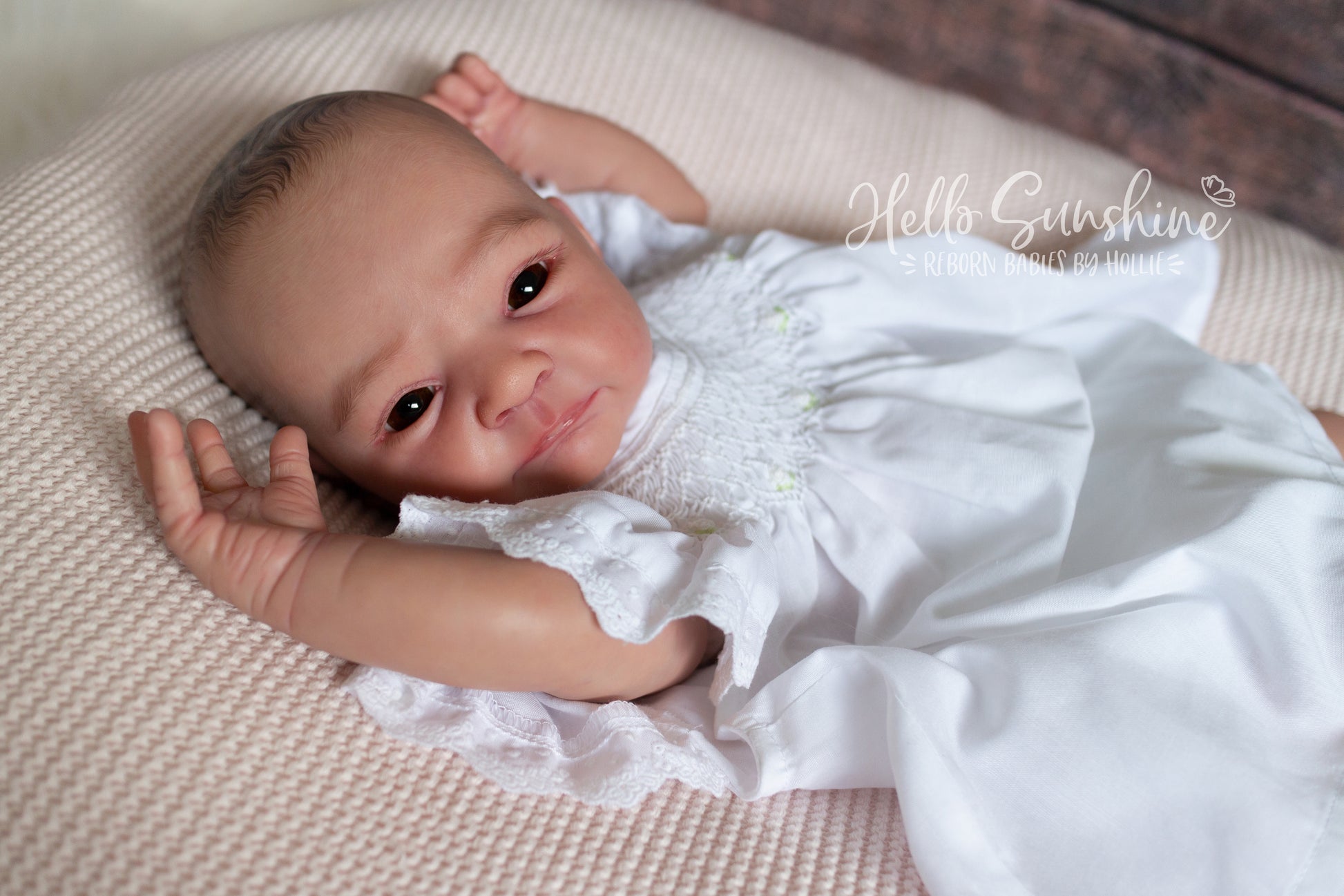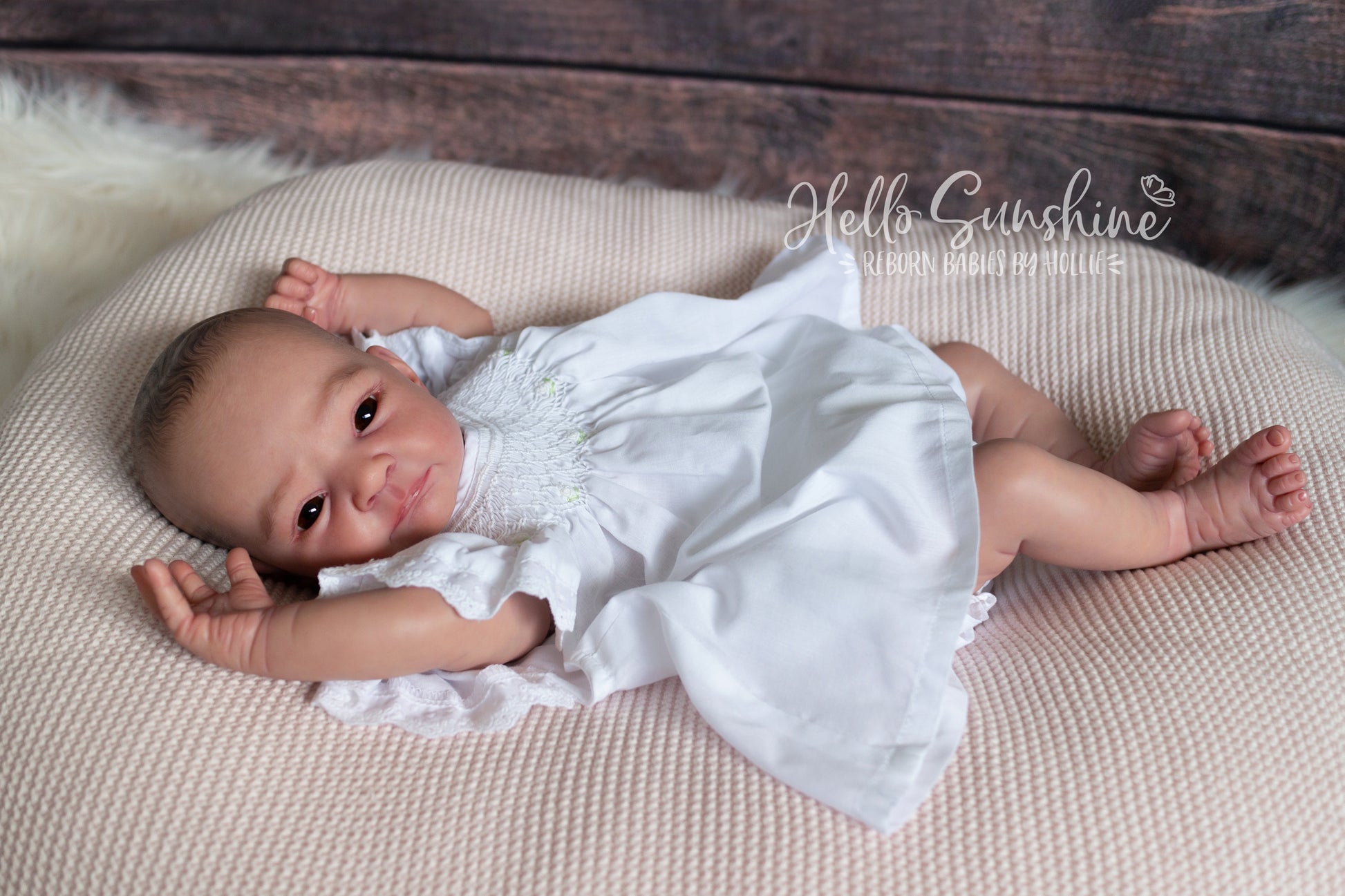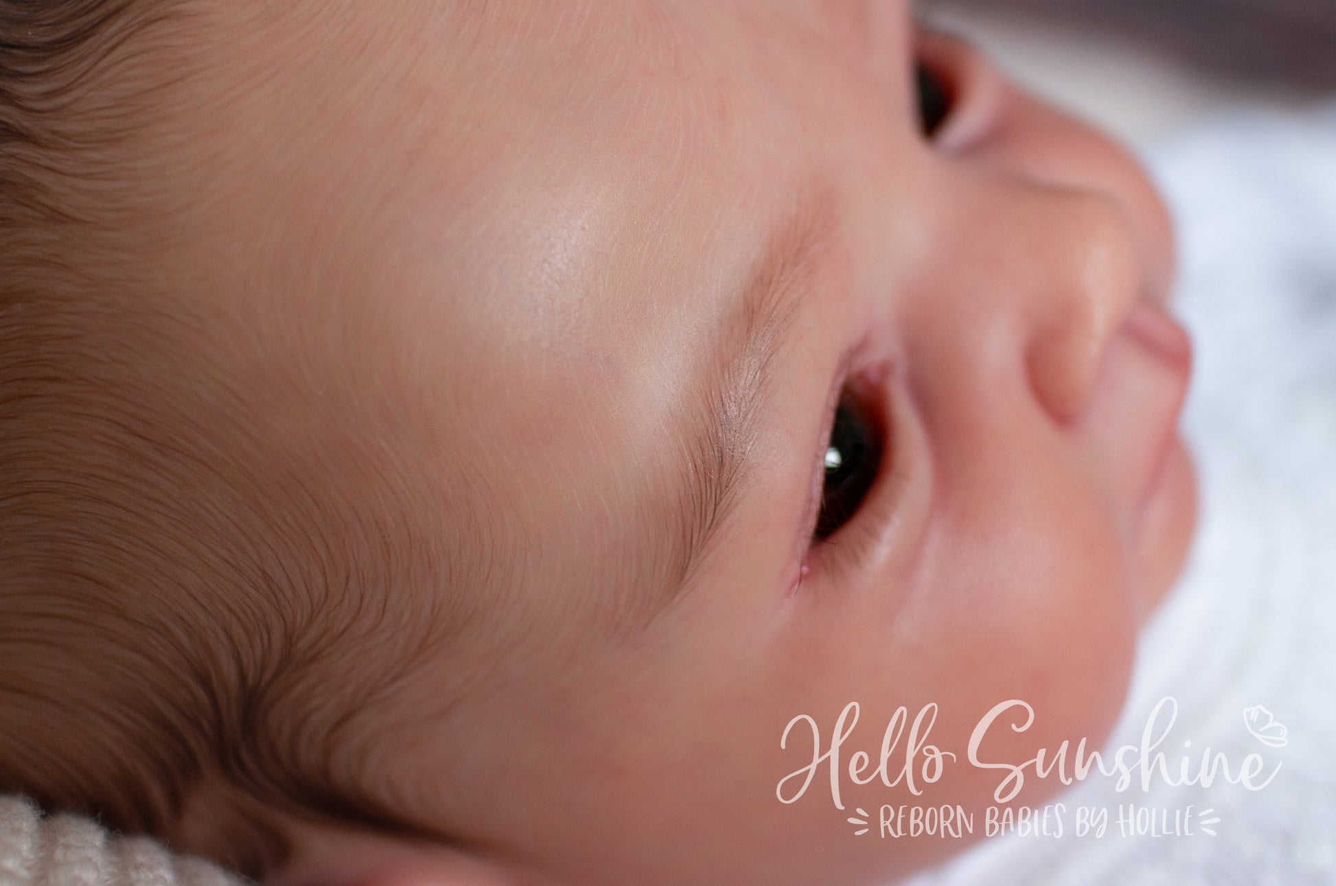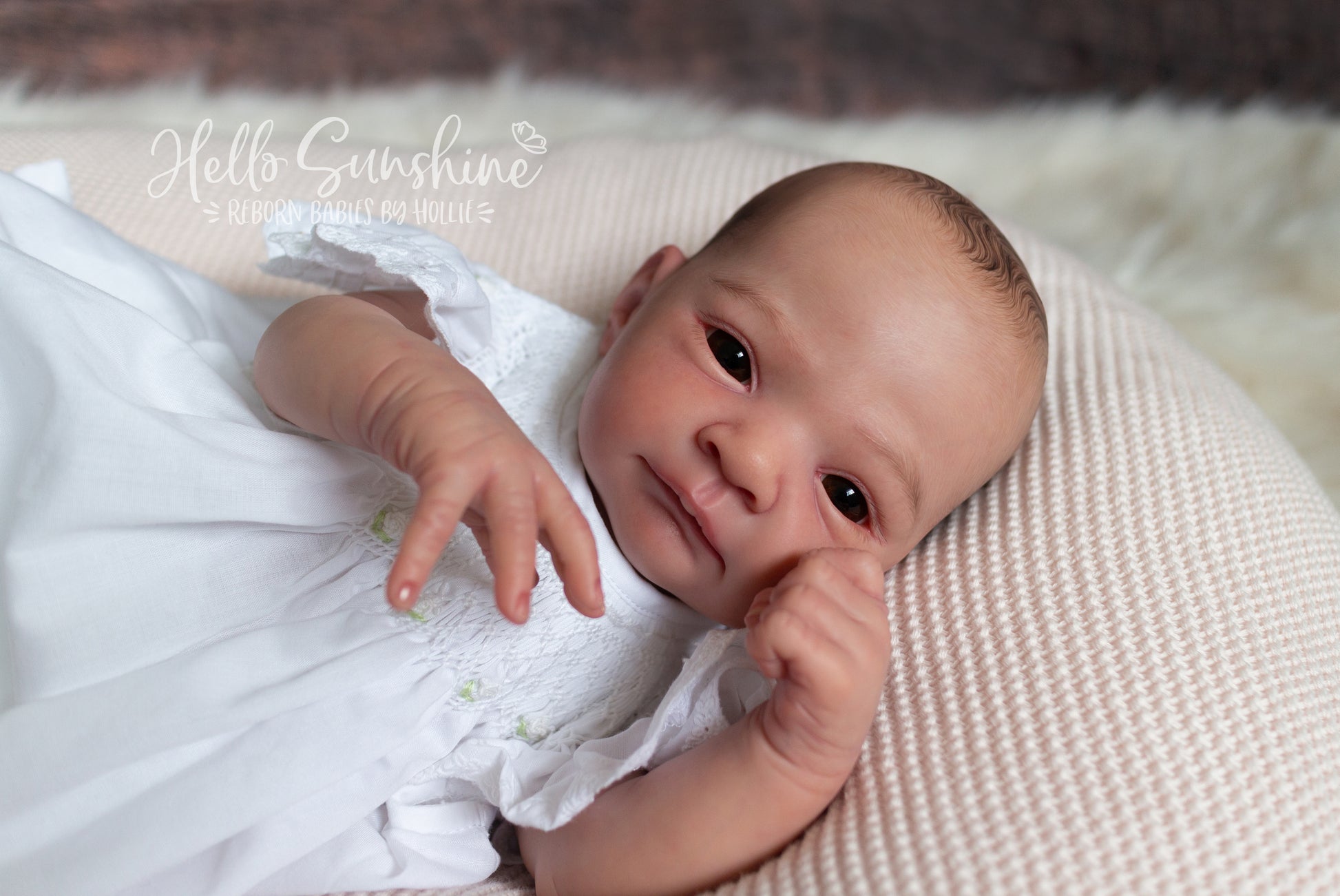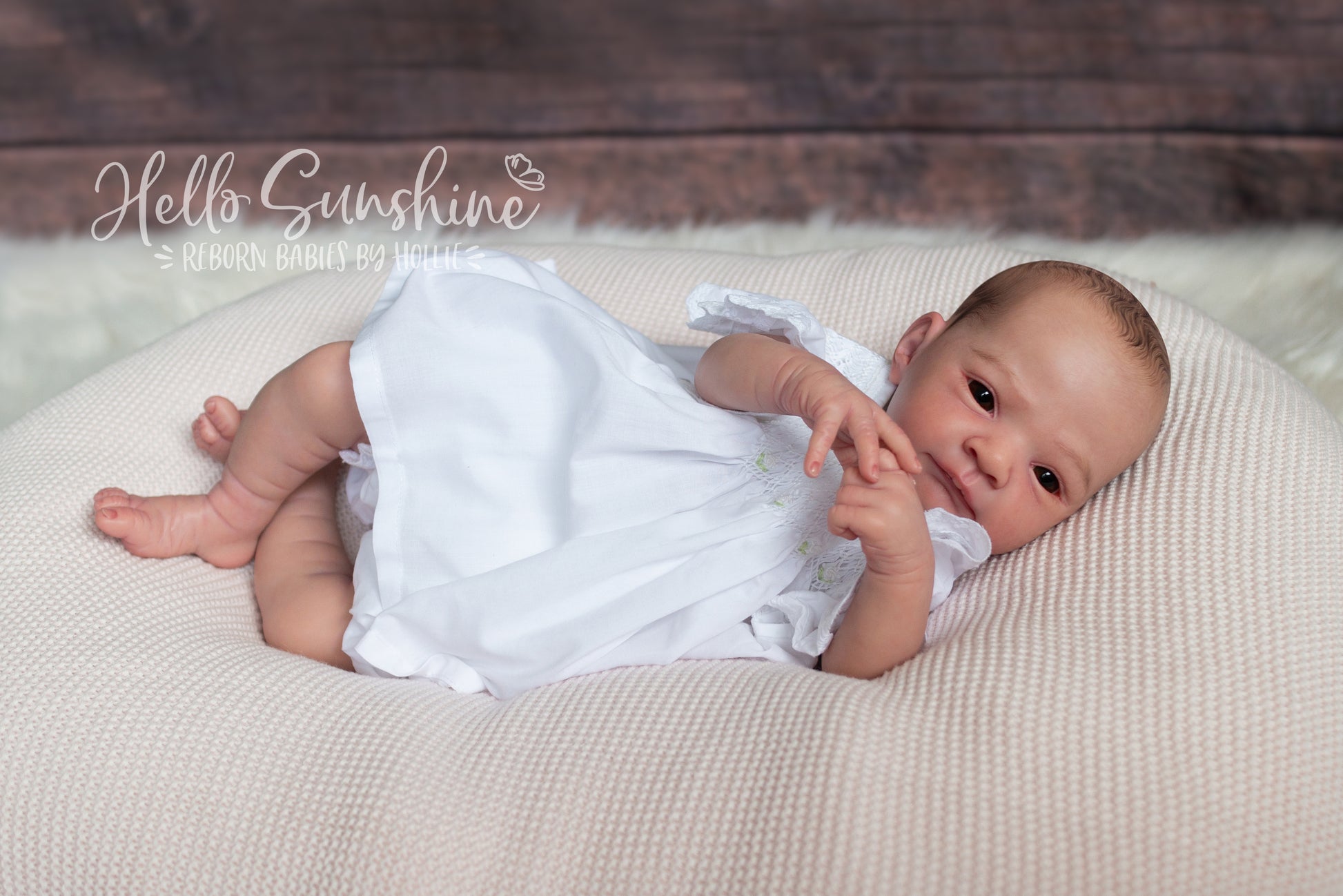 This sweet portrait reborn of the real-life Meki, went home with weighted swivel vinyl limbs, faux suede weighted body, magnet dummy, onesies, bloomers, two-piece romper set, smocked dress with bloomers and knitted wrap.