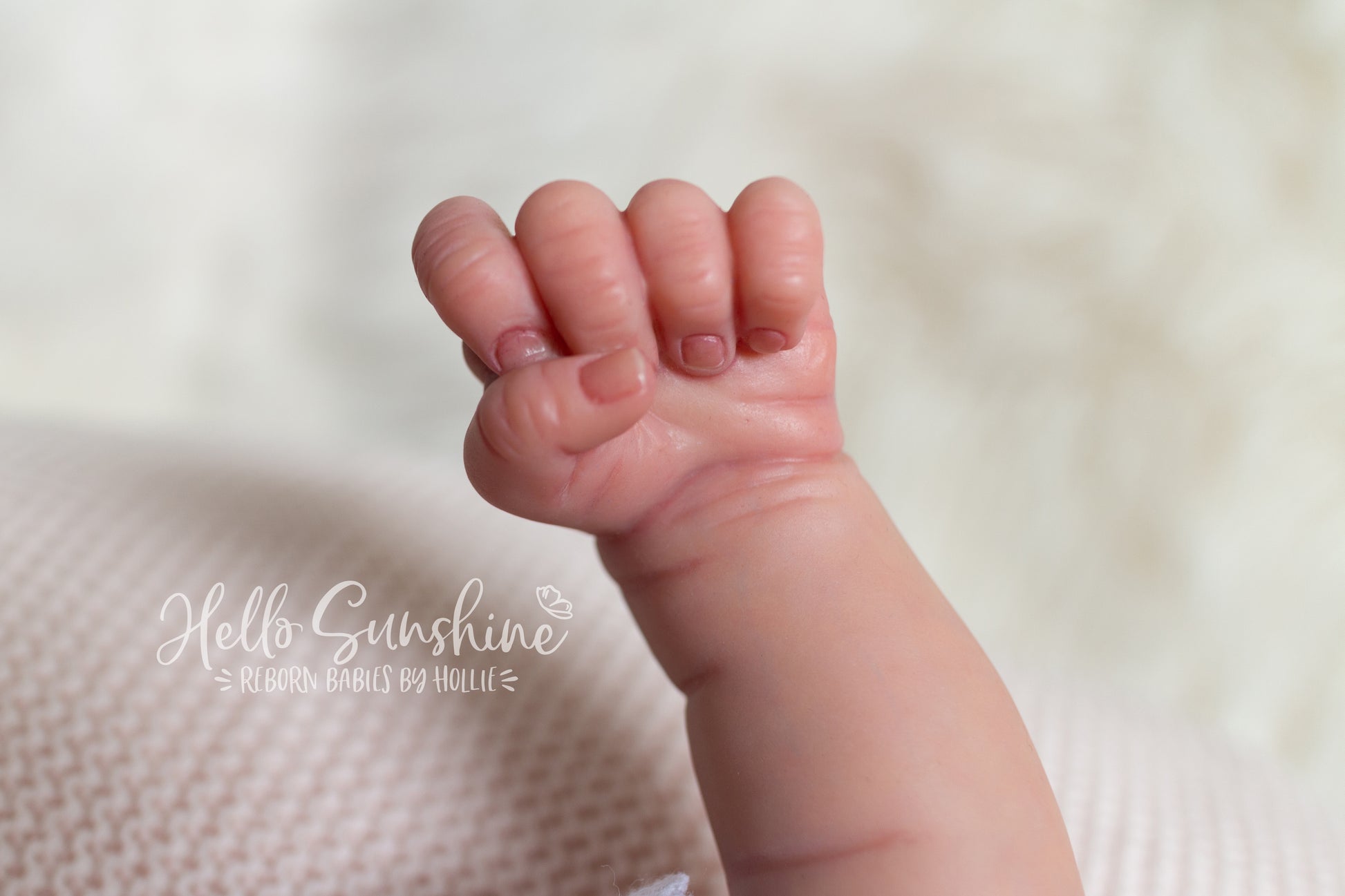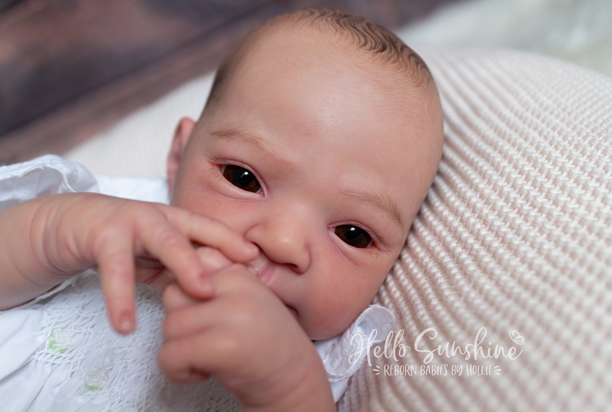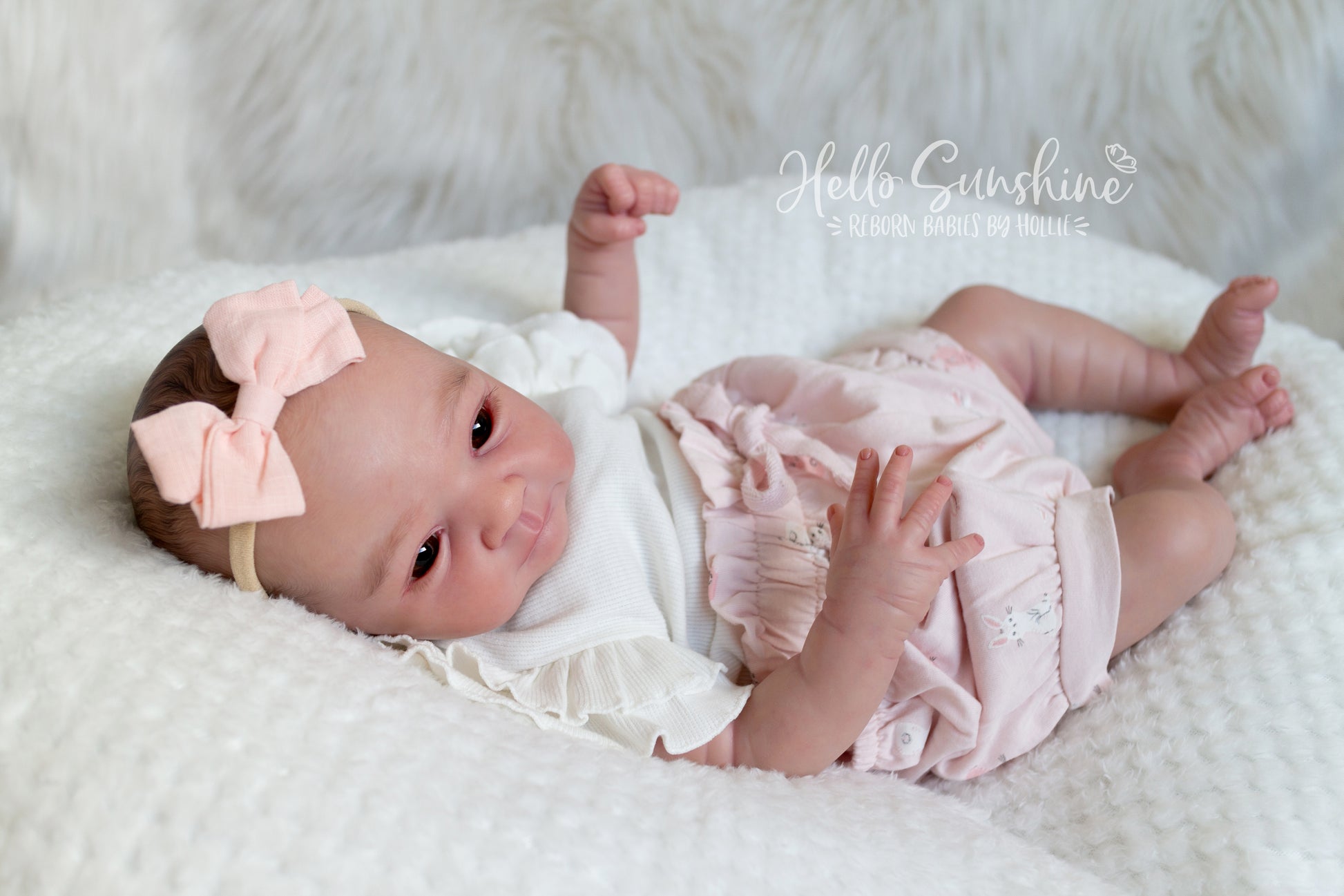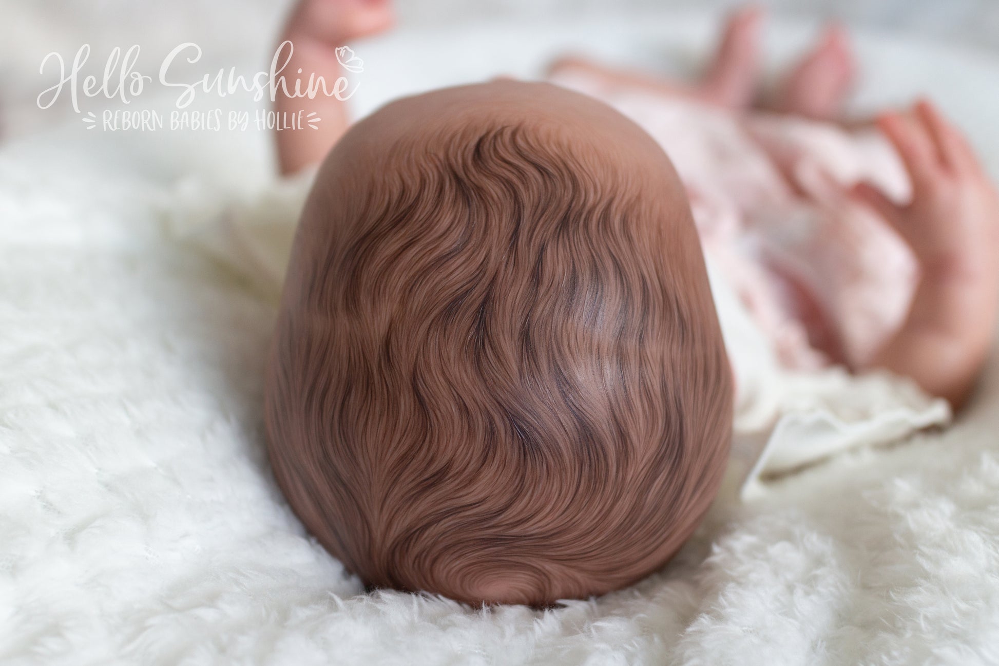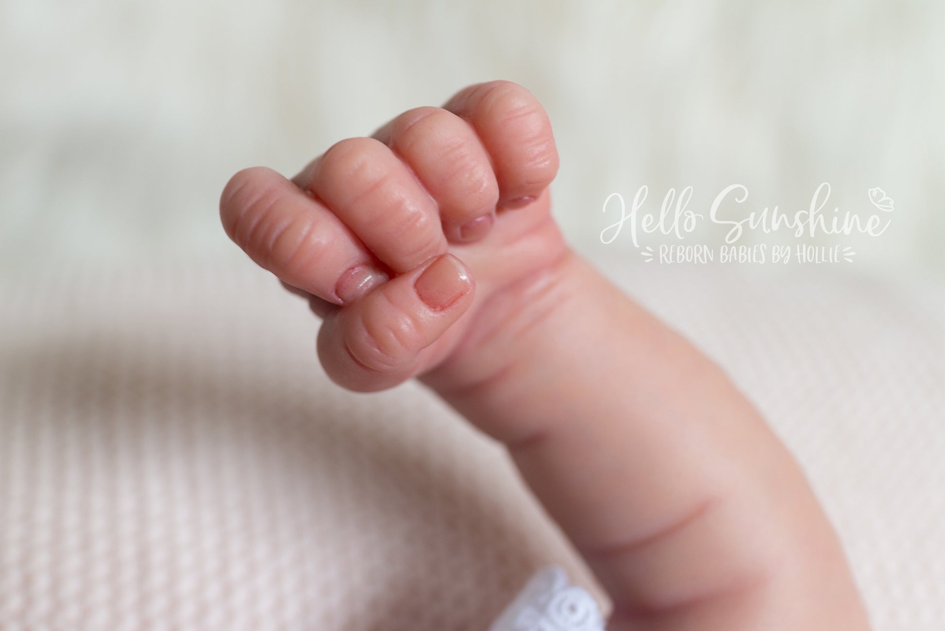 This sweet portrait reborn of the real-life Meki, went home with weighted swivel vinyl limbs, faux suede weighted body, magnet dummy, onesies, bloomers, two-piece romper set, smocked dress with bloomers and knitted wrap.