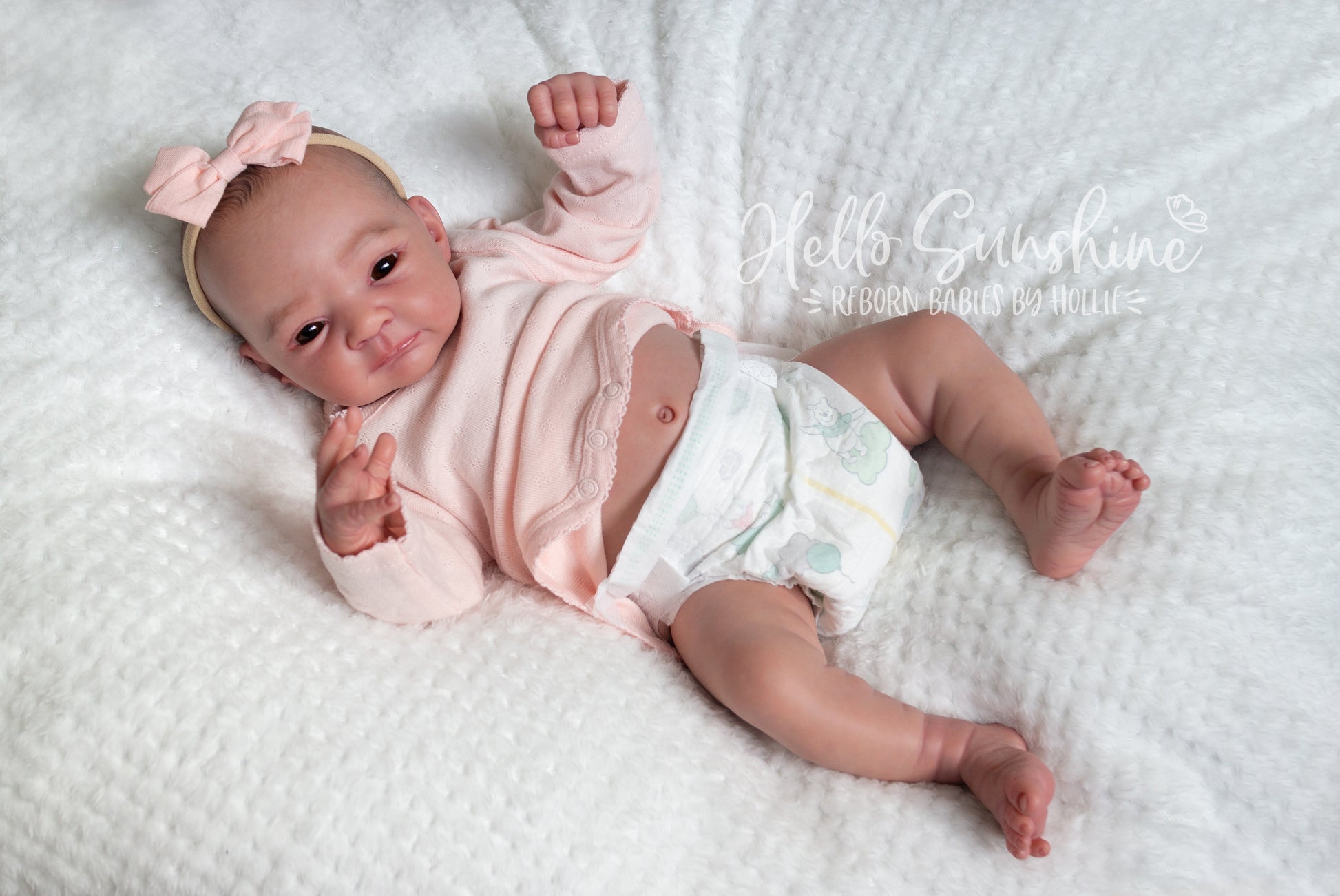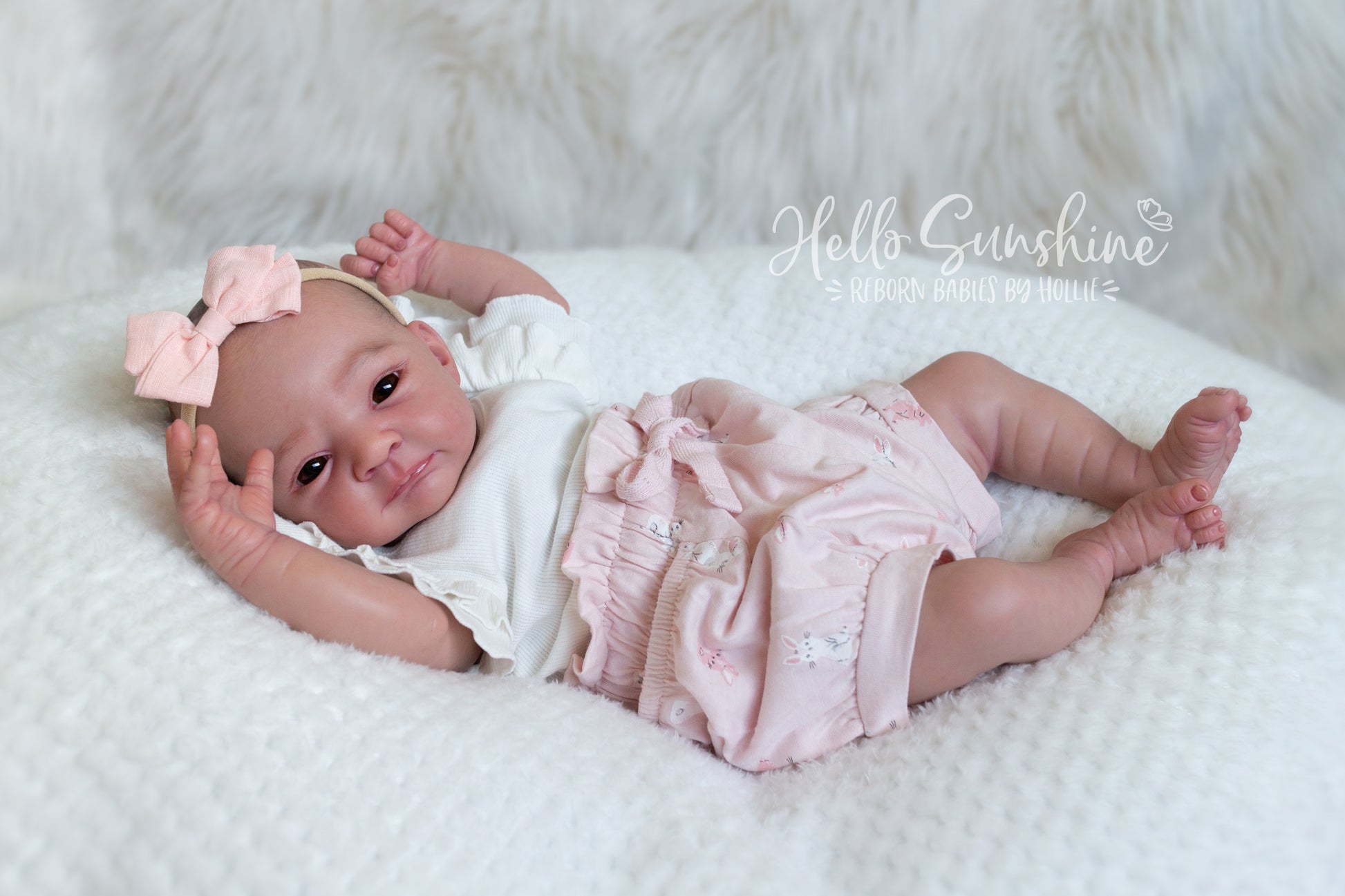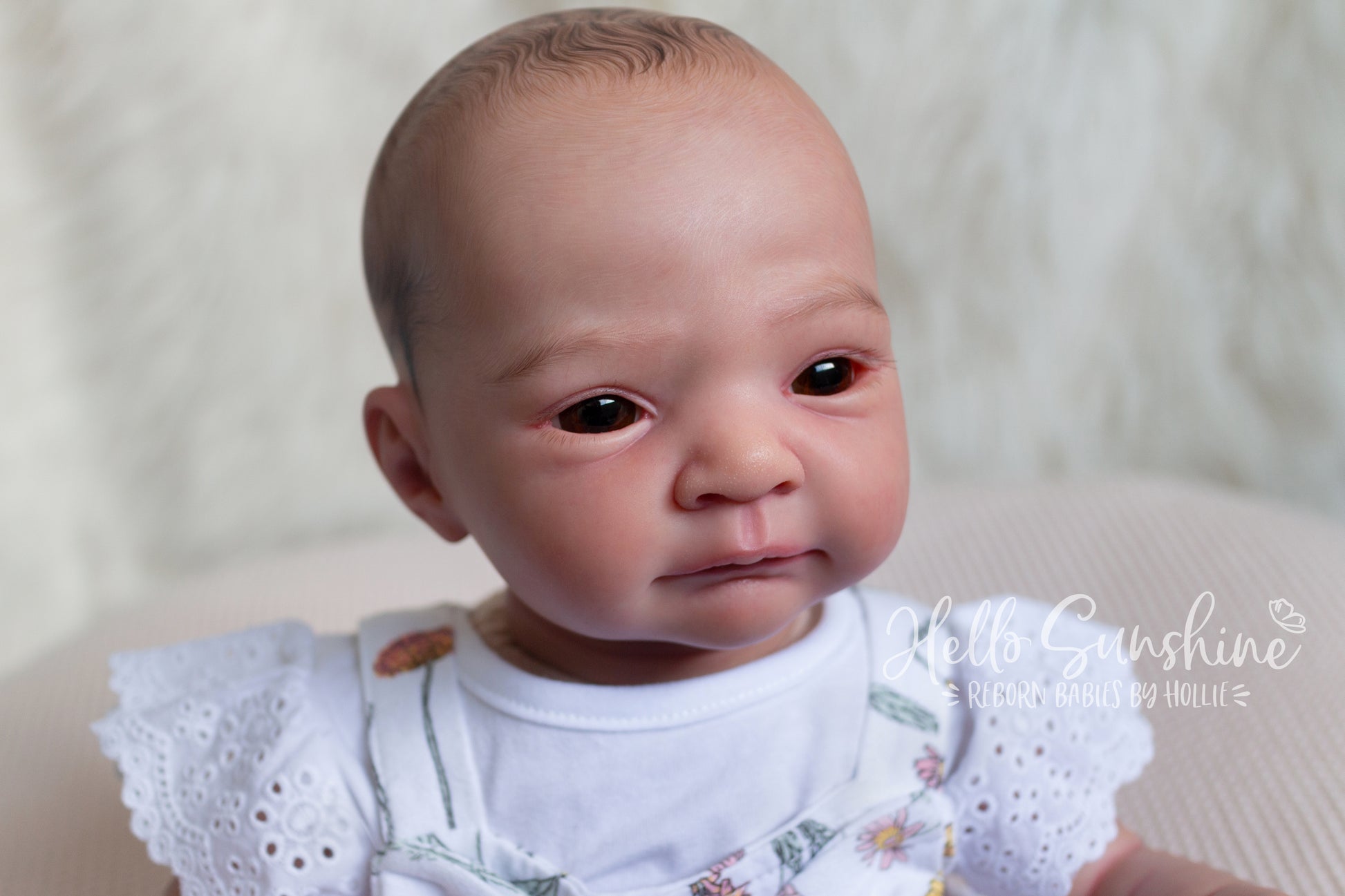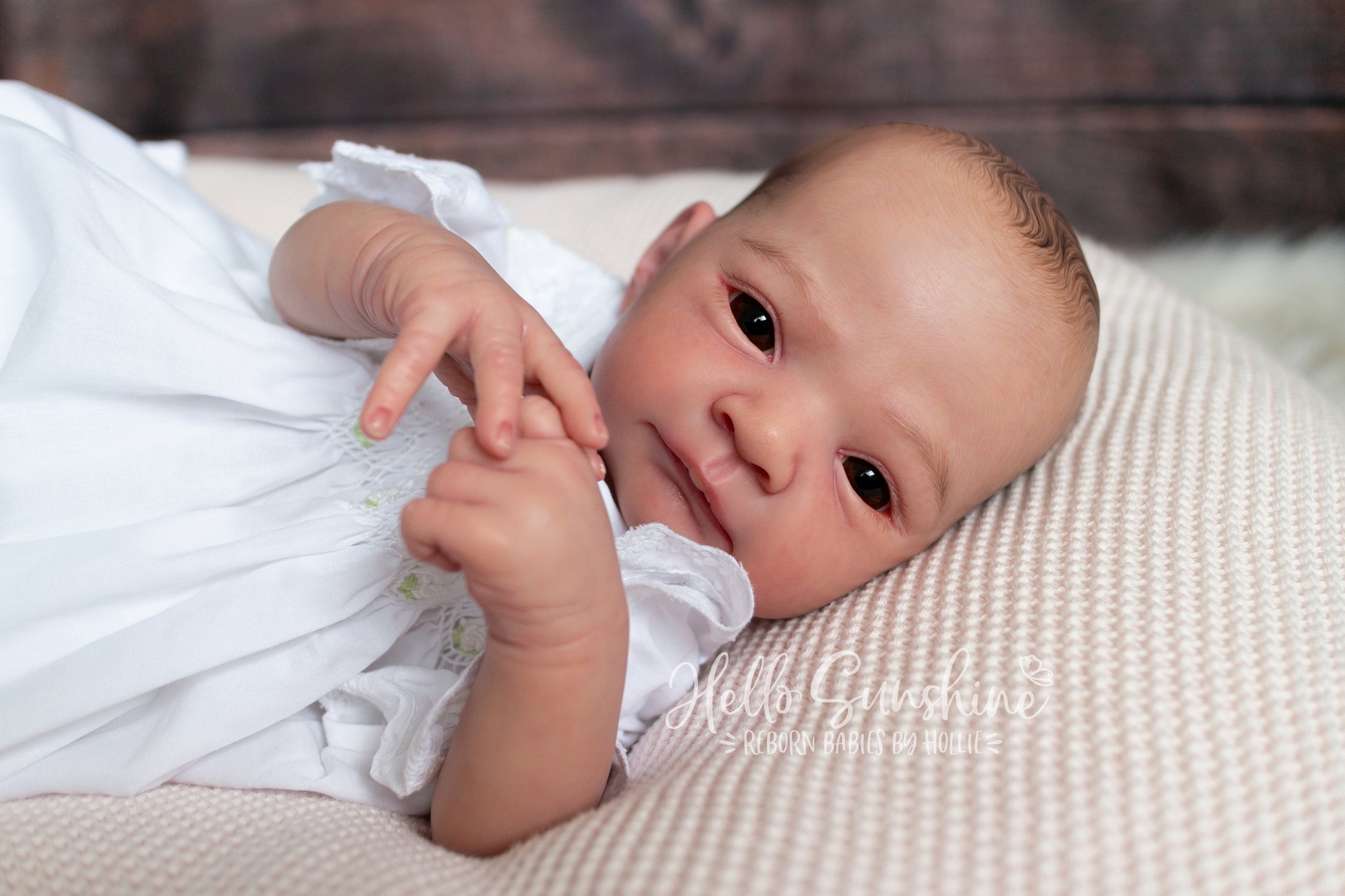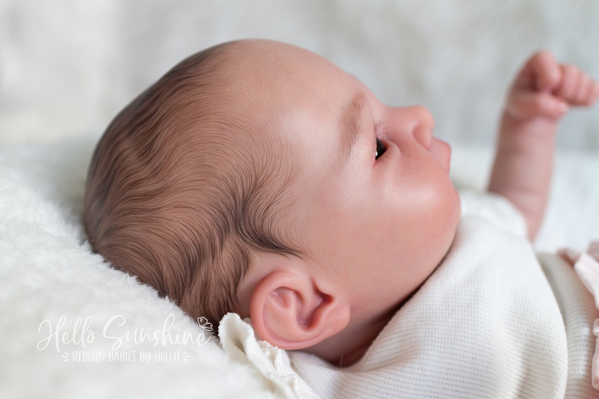 This sweet portrait reborn of the real-life Meki, went home with weighted swivel vinyl limbs, faux suede weighted body, magnet dummy, onesies, bloomers, two-piece romper set, smocked dress with bloomers and knitted wrap.