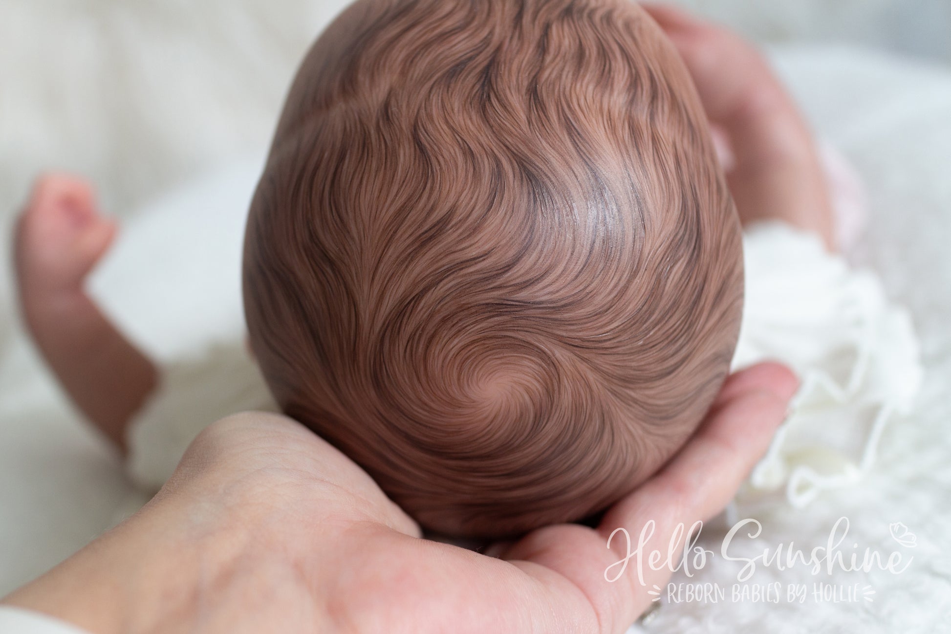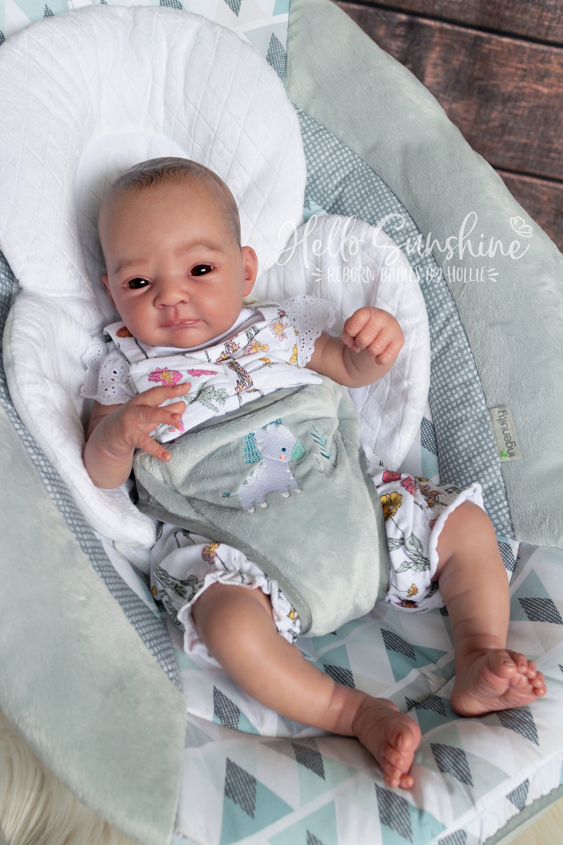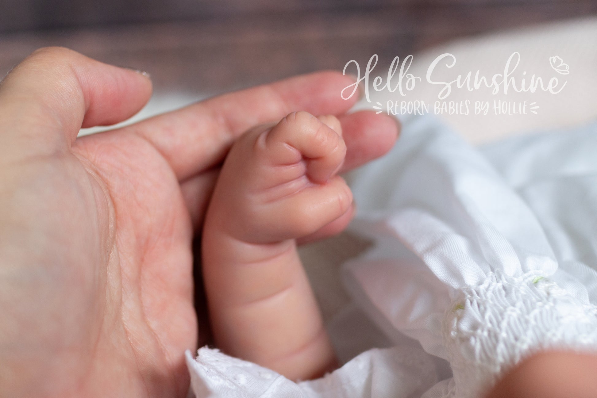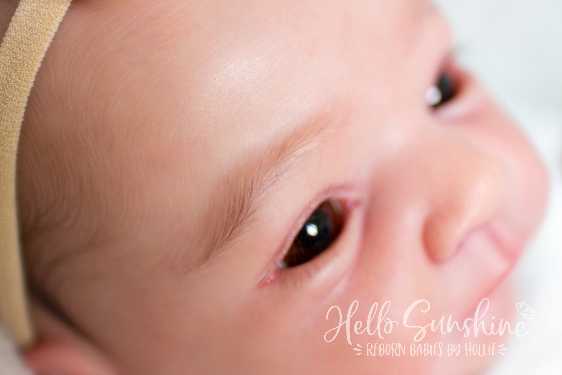 This sweet portrait reborn of the real-life Meki, went home with weighted swivel vinyl limbs, faux suede weighted body, magnet dummy, onesies, bloomers, two-piece romper set, smocked dress with bloomers and knitted wrap.