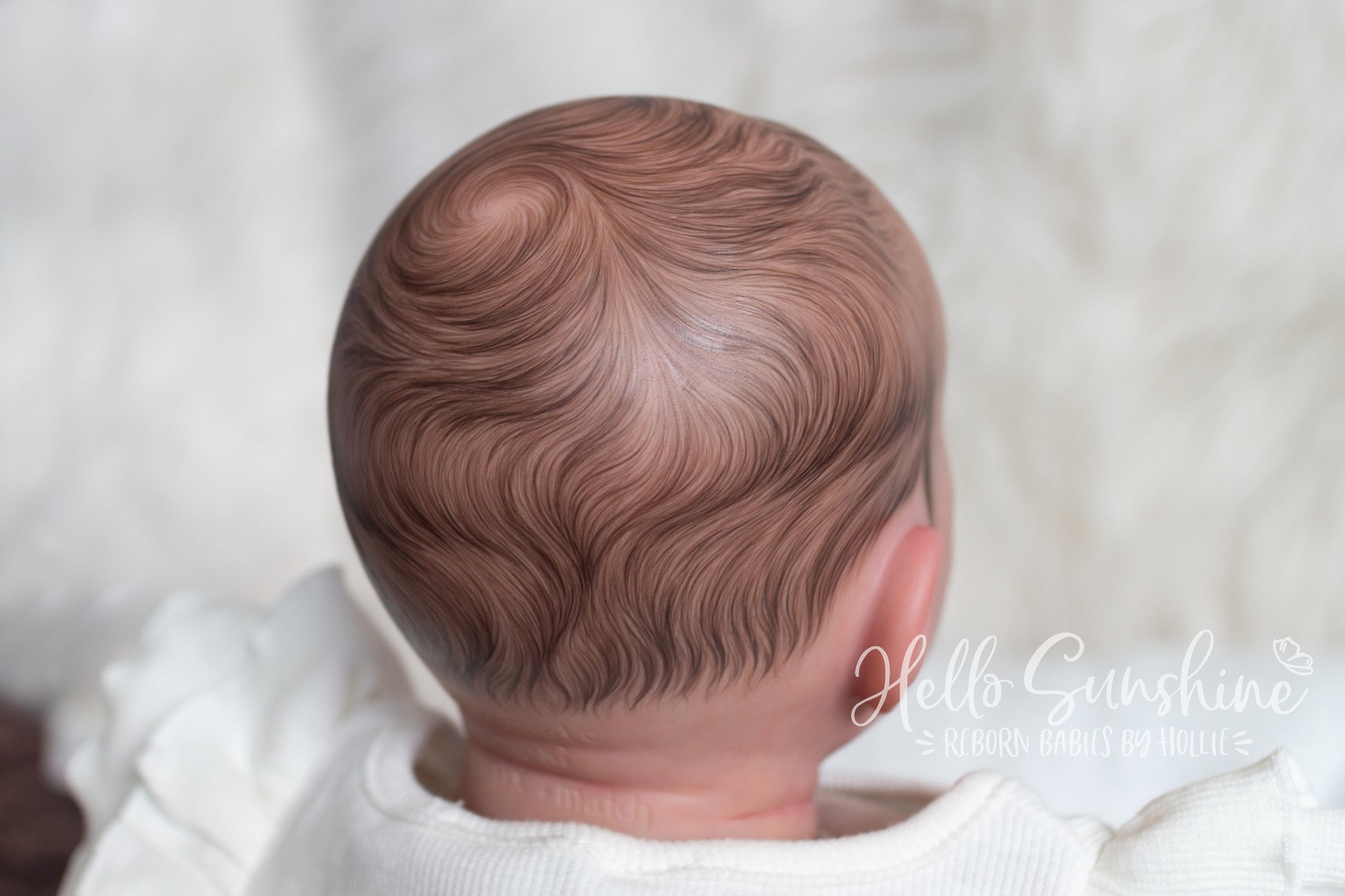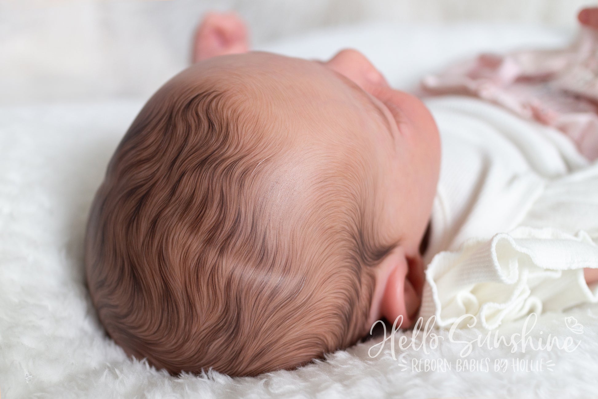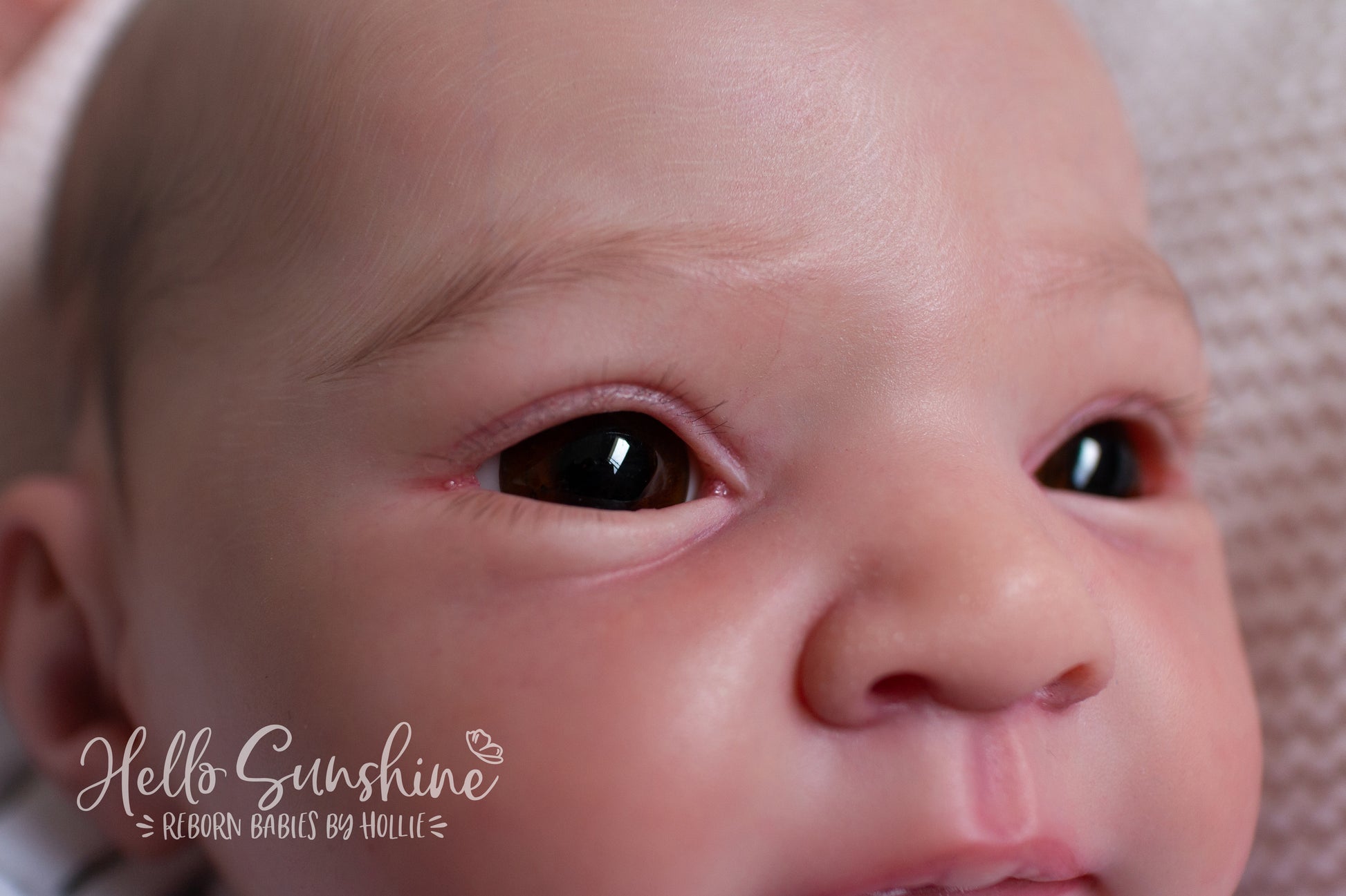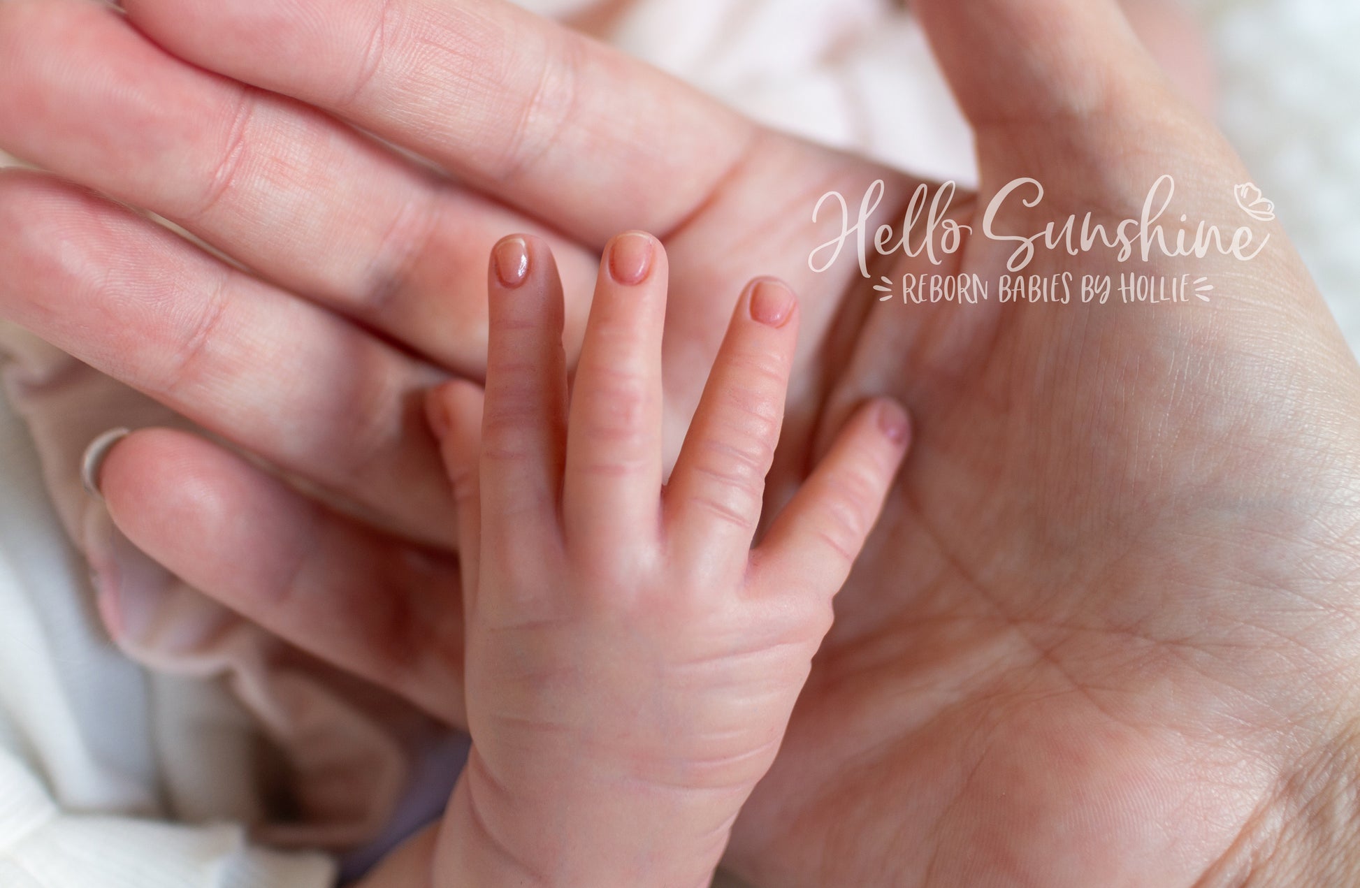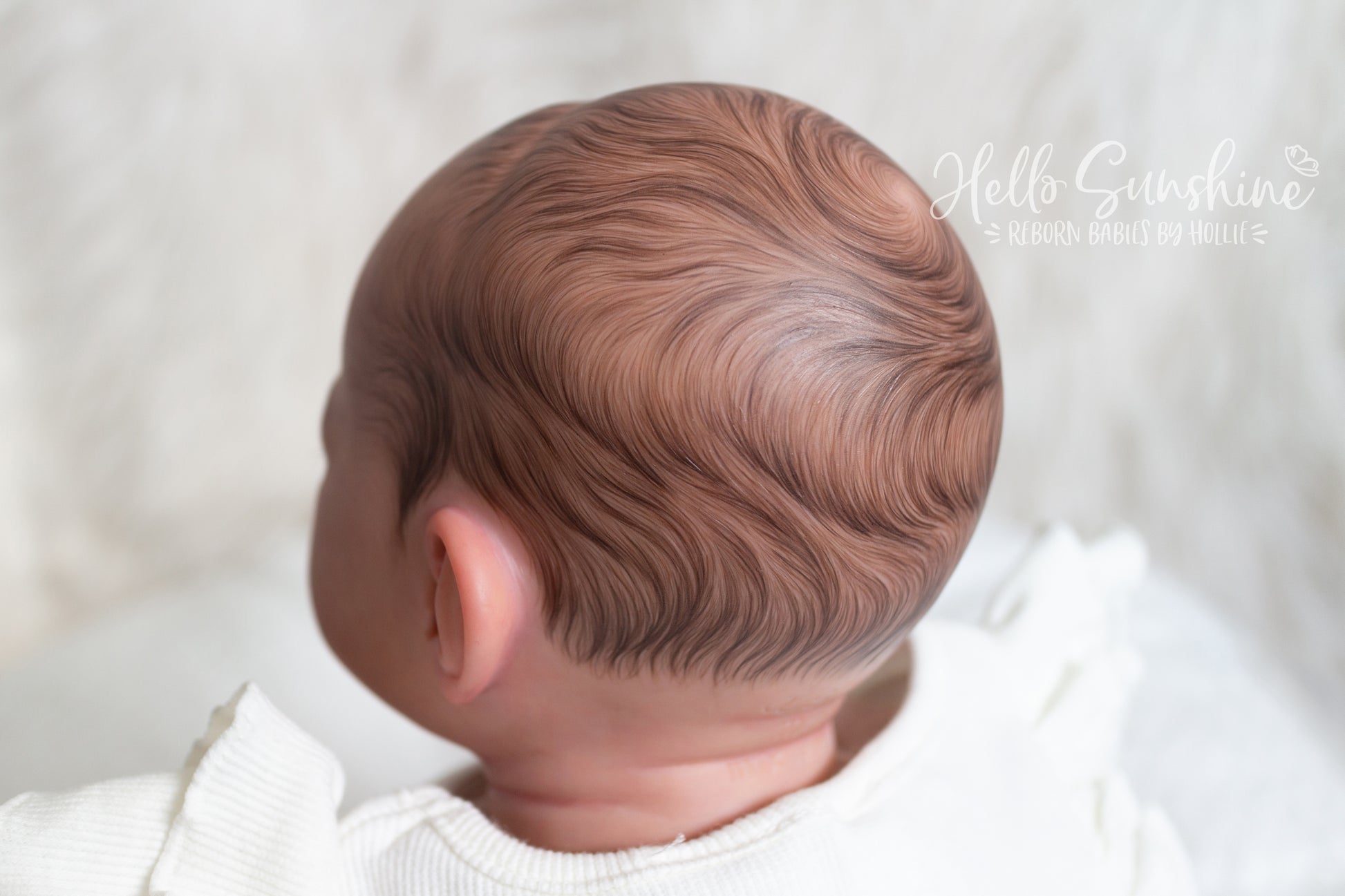 This sweet portrait reborn of the real-life Meki, went home with weighted swivel vinyl limbs, faux suede weighted body, magnet dummy, onesies, bloomers, two-piece romper set, smocked dress with bloomers and knitted wrap.