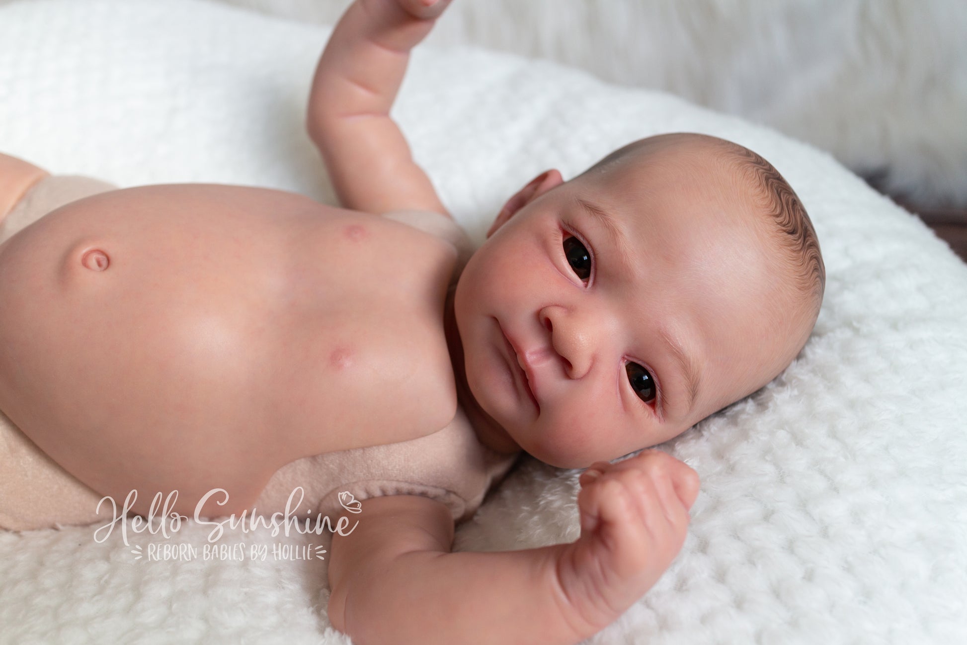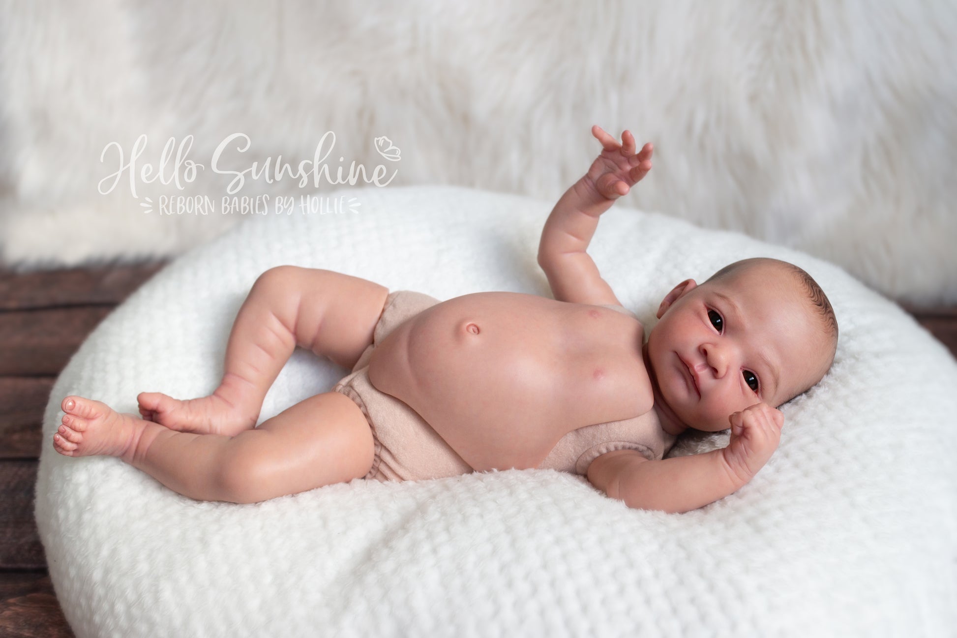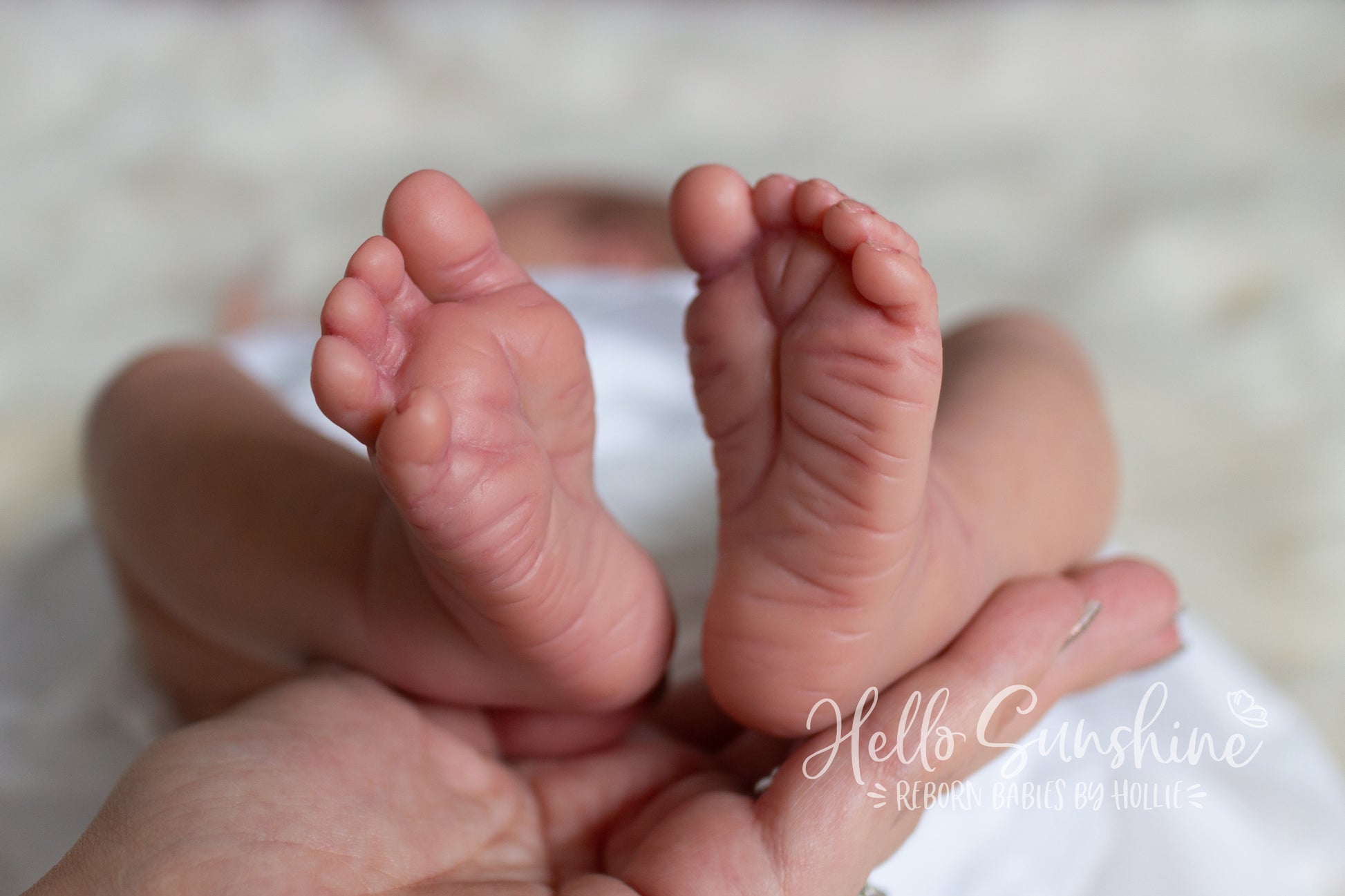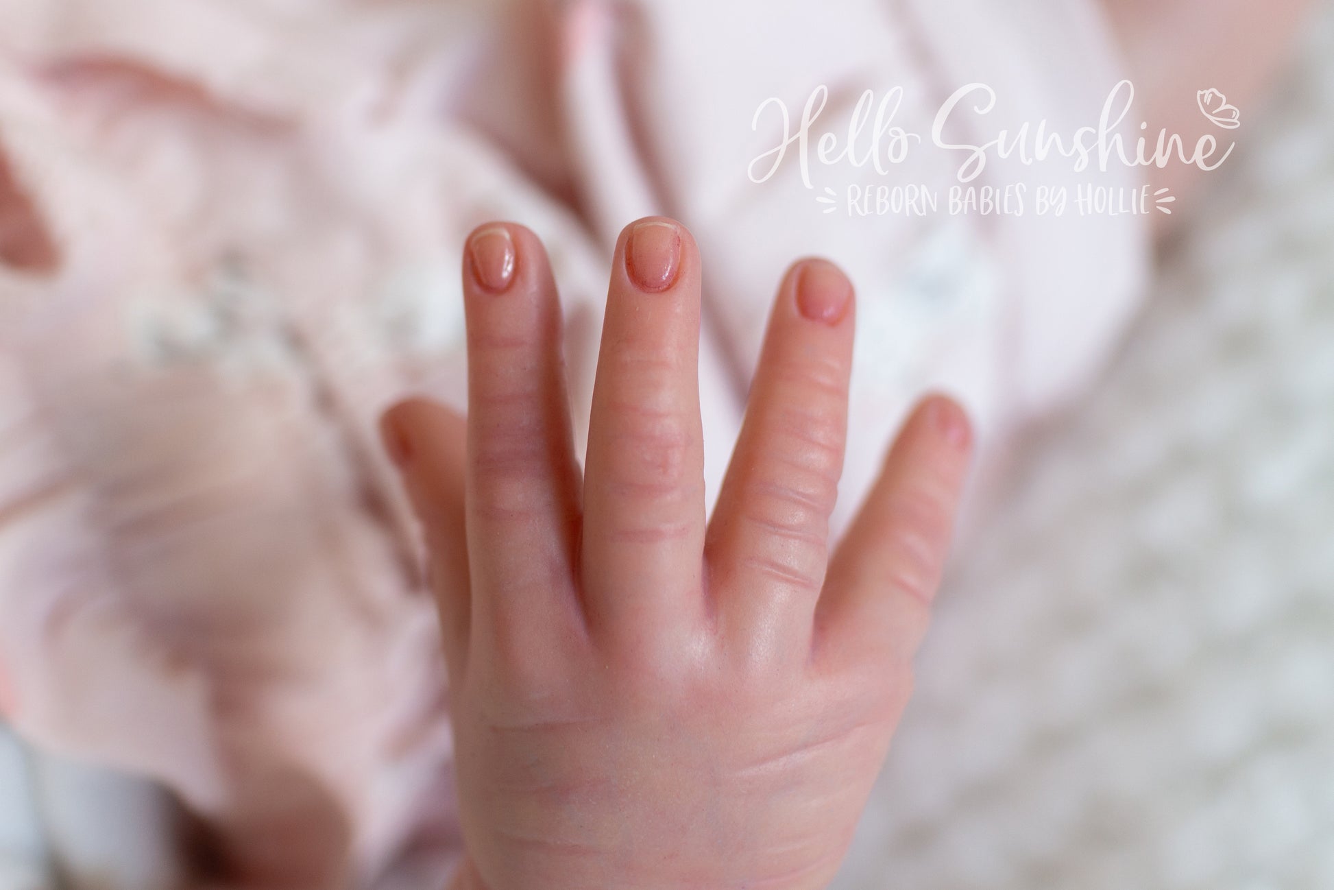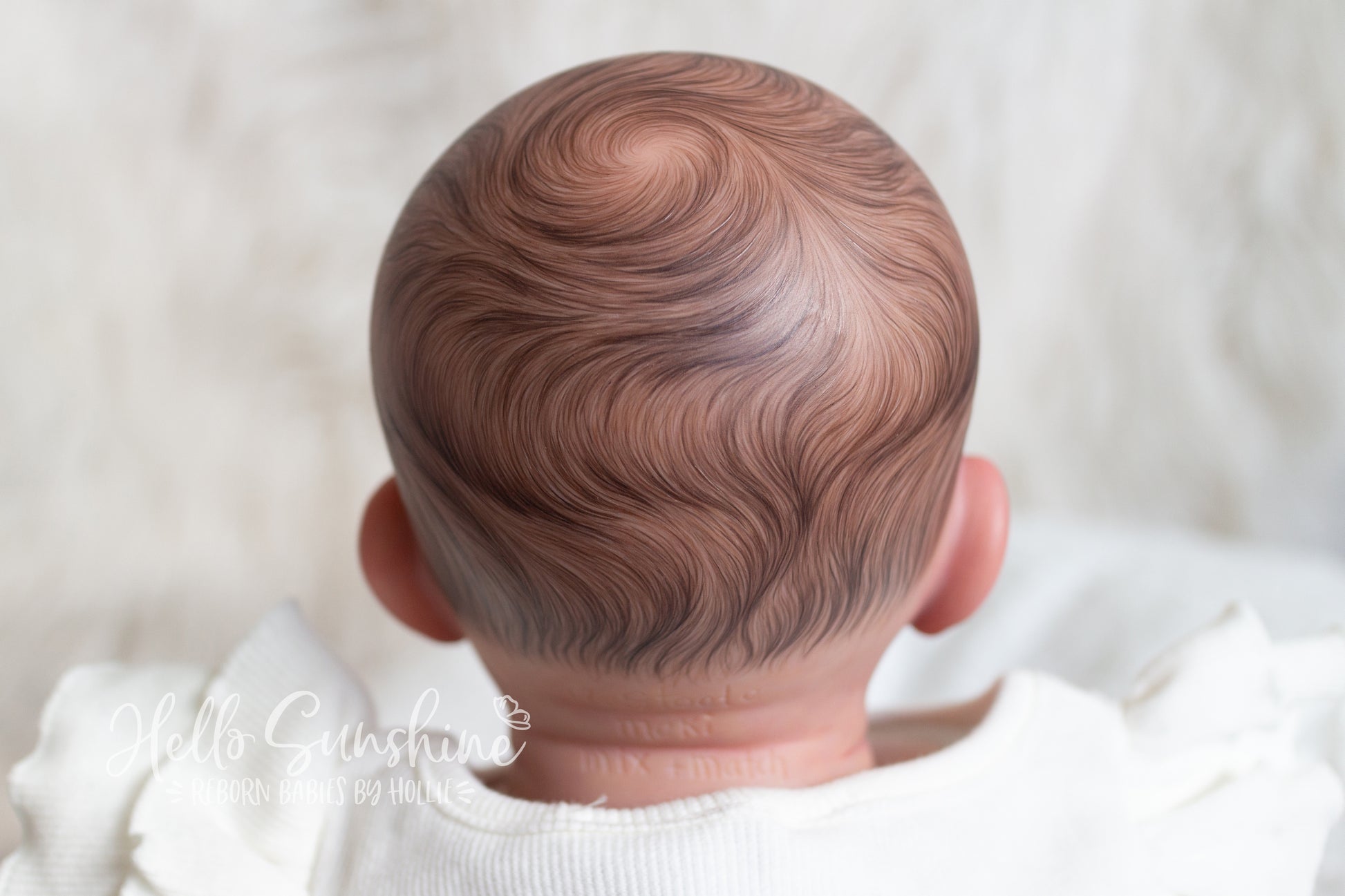 This sweet portrait reborn of the real-life Meki, went home with weighted swivel vinyl limbs, faux suede weighted body, magnet dummy, onesies, bloomers, two-piece romper set, smocked dress with bloomers and knitted wrap.